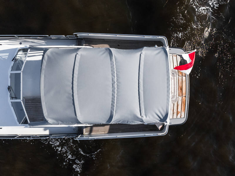 An Deck gibt es ein festes, großzügiges Sofa mit angenehmen Kissen und das Achterdeck lässt sich rundum das Sofa mit einem extra großen Verdeck vollständig abschließen.
