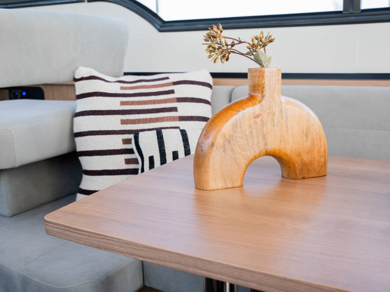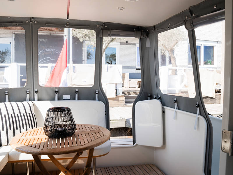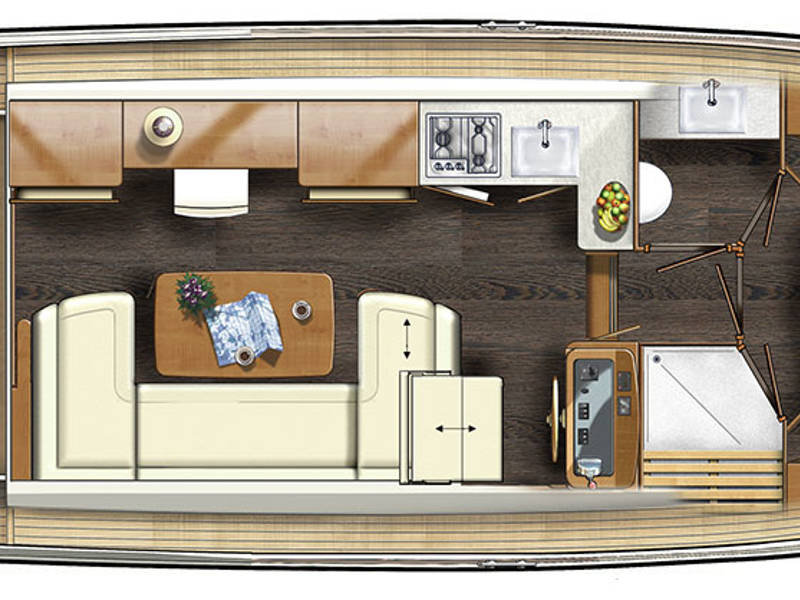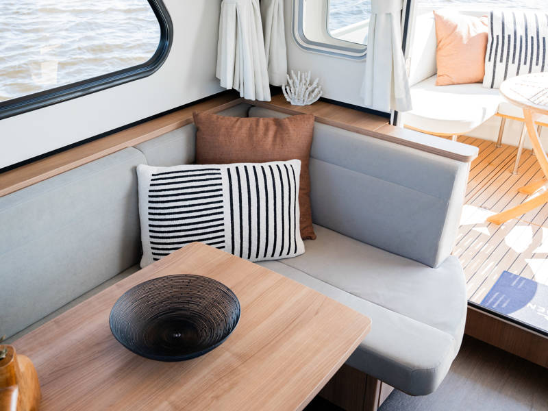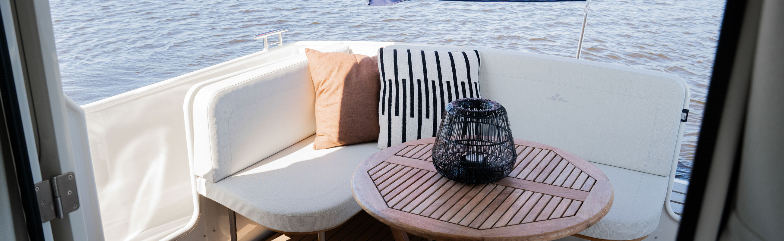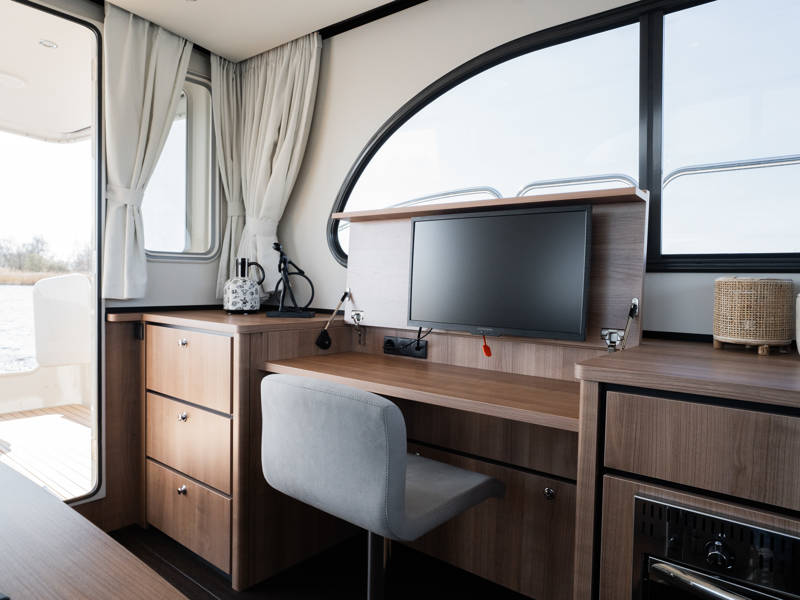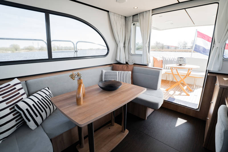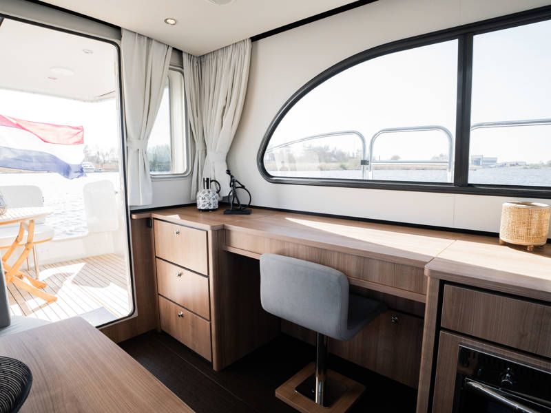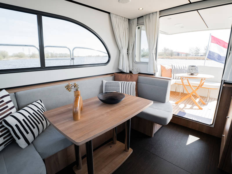 Der Salon ist mit großen Klapptüren ausgestattet, die Zugang zum offenen Cockpit bieten, wo sich ein großes Sofa befindet. Dieses Cockpit ist abschließbar und beheizbar für viele gemütliche Stunden an Bord.
