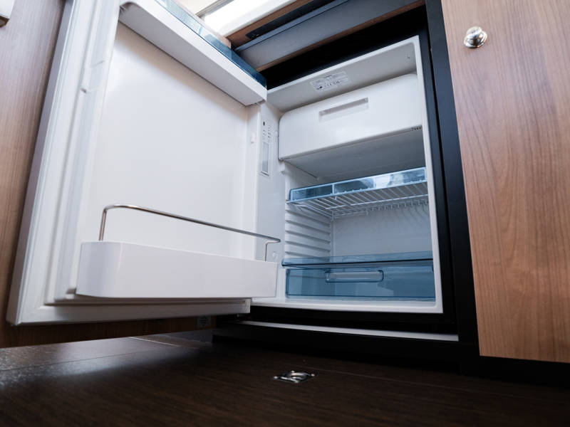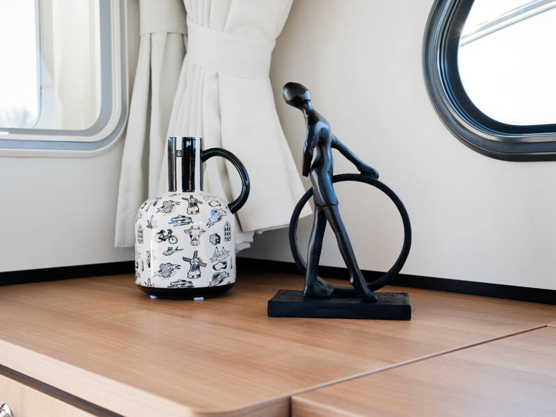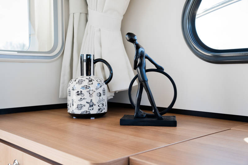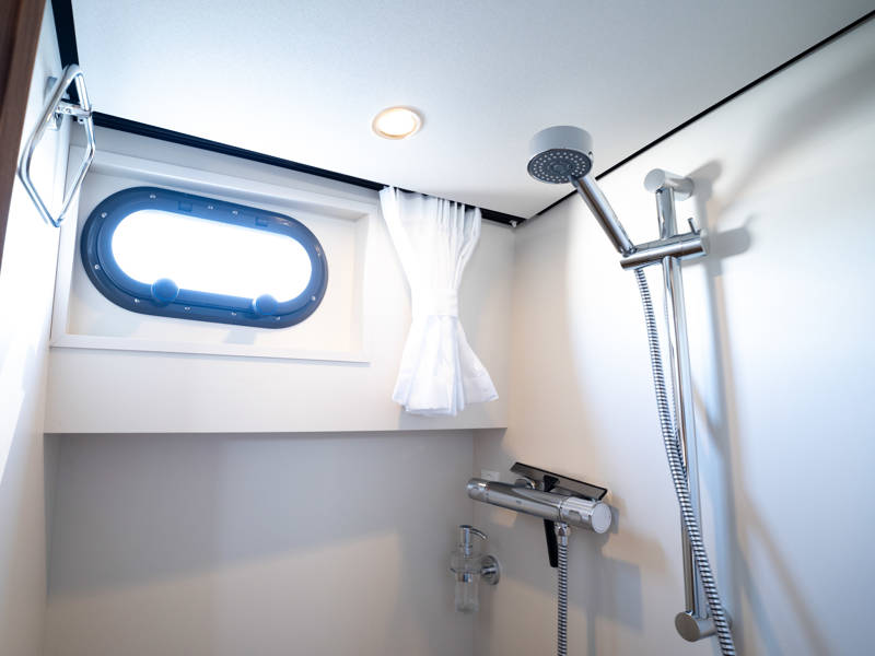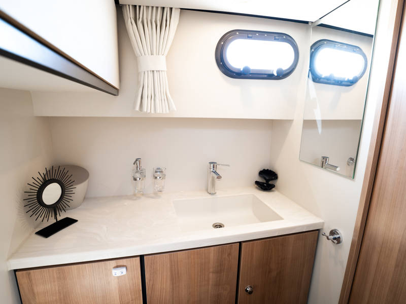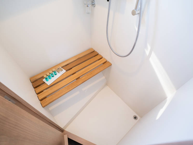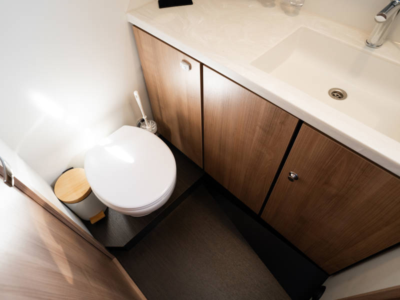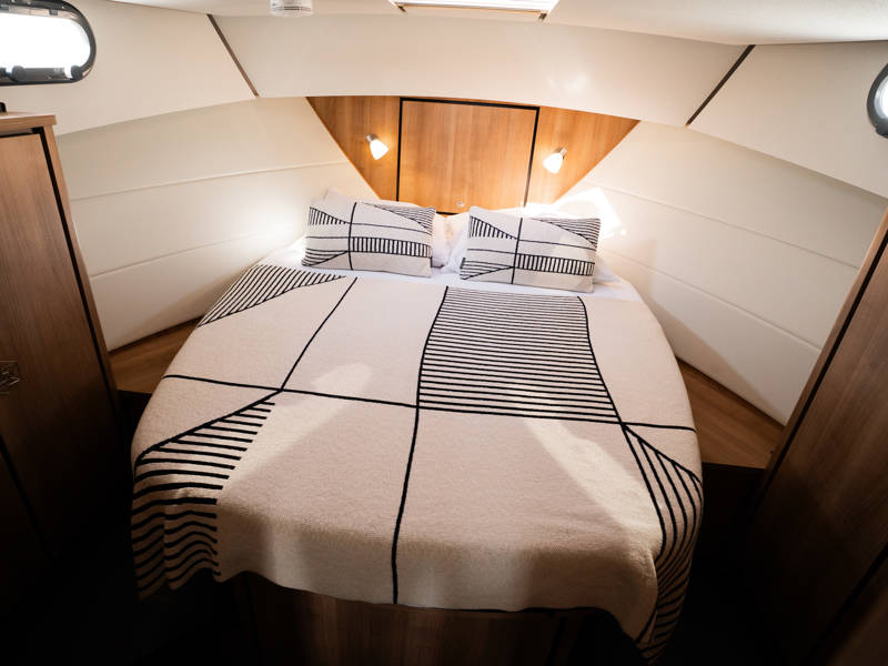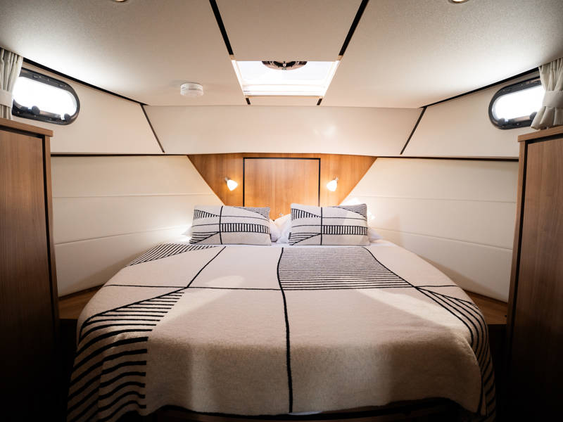 Die kompakte Yacht bietet erstaunlich viel Platz! In der vorderen Kabine befindet sich eine gemütliche Kapitänskajüte mit einem Doppelbett, einem Badezimmer mit elektrischer Toilette und Waschbecken und einer separaten Nasszelle mit Dusche.