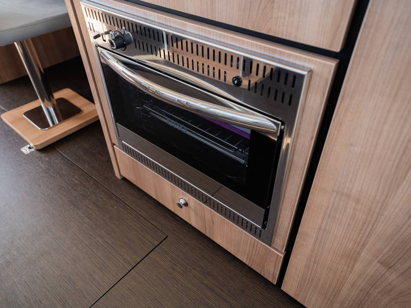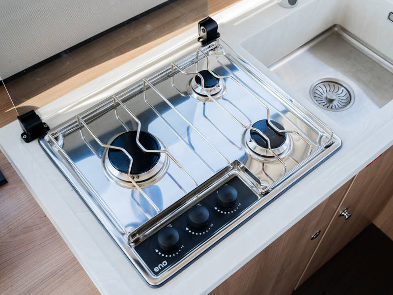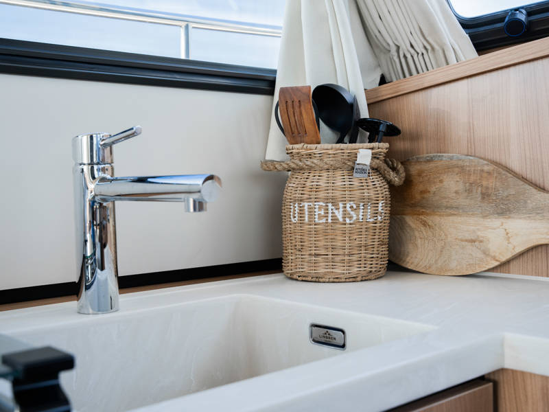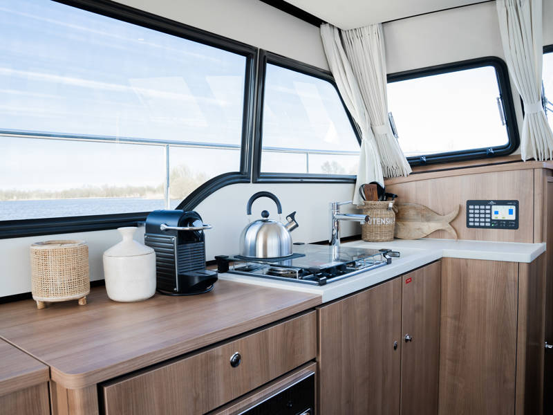 Die Küche befindet sich auf der Backbordseite und ist ua mit einem Herd, einer Nespresso-Maschine und einem kompletten Kücheninventar ausgestattet.