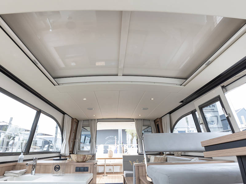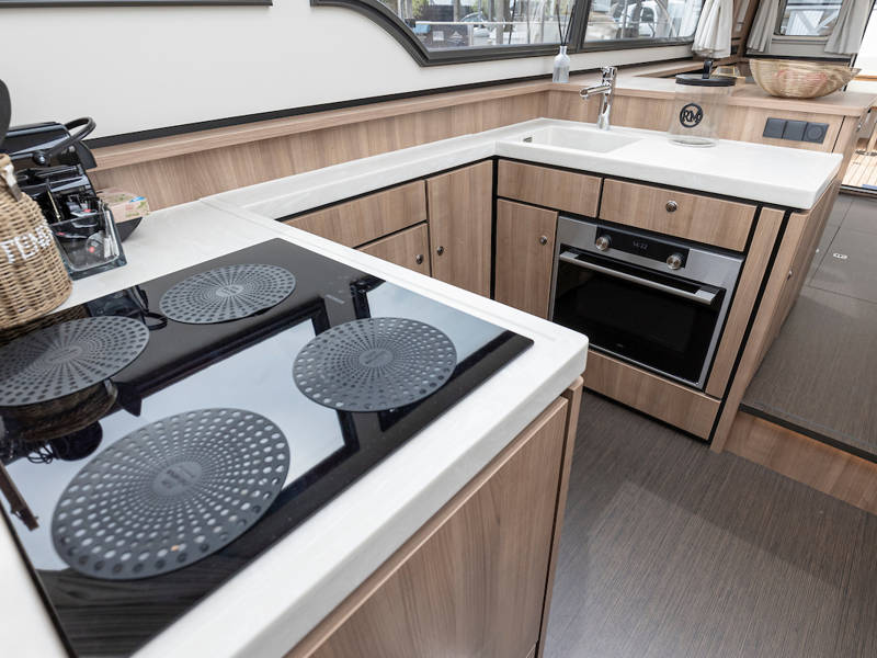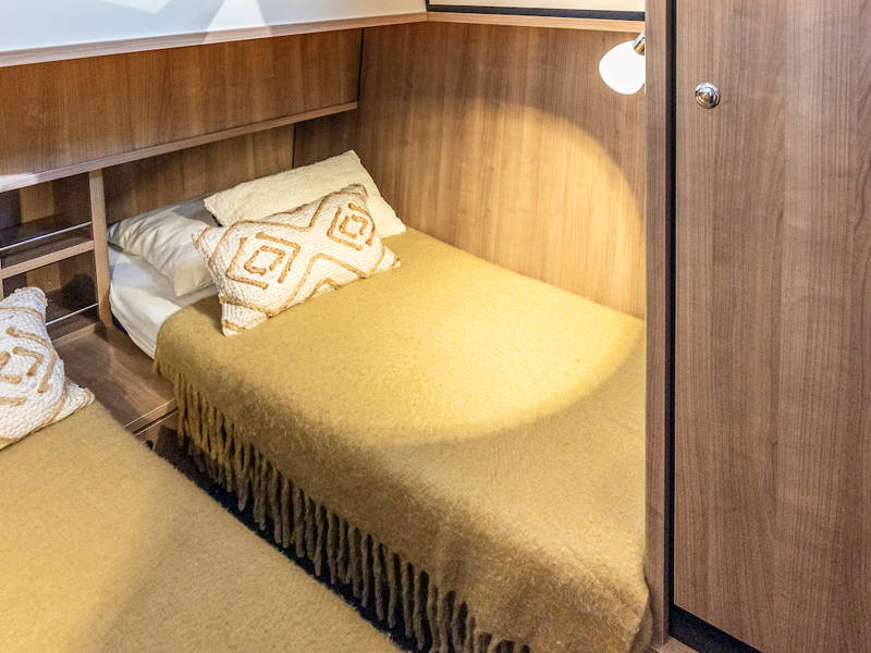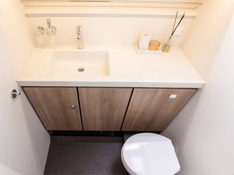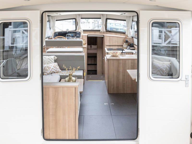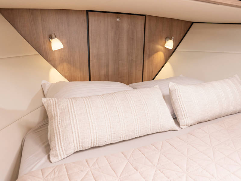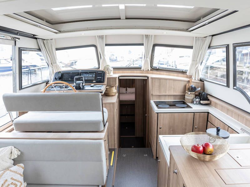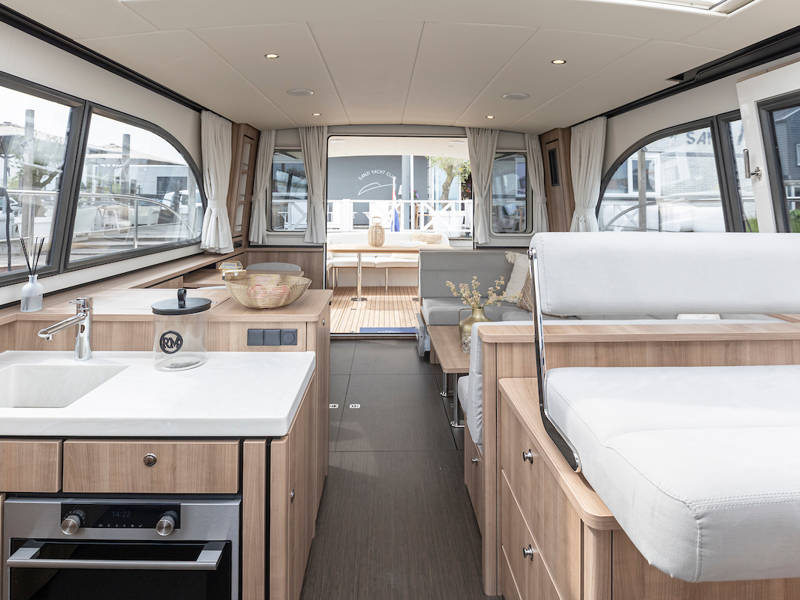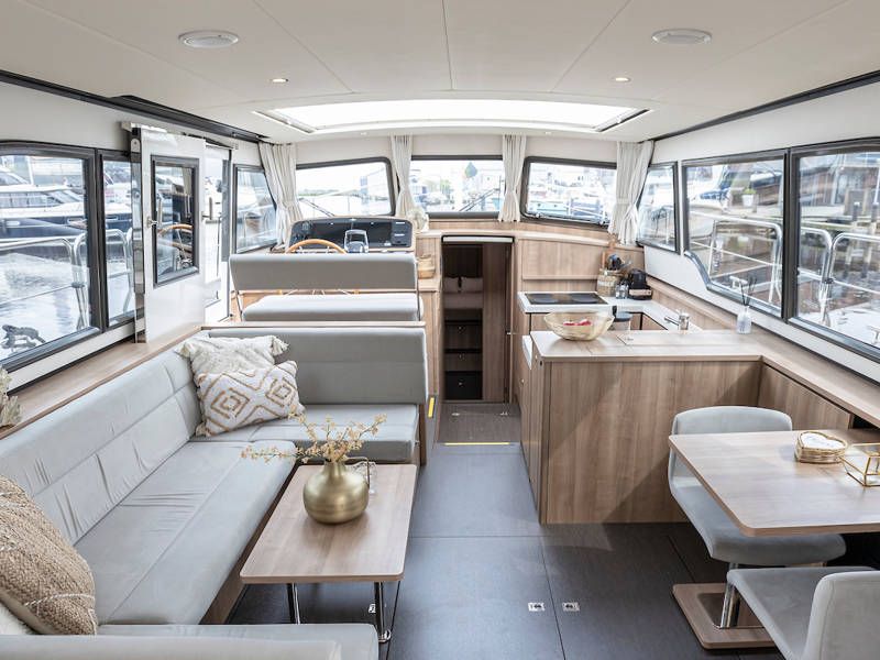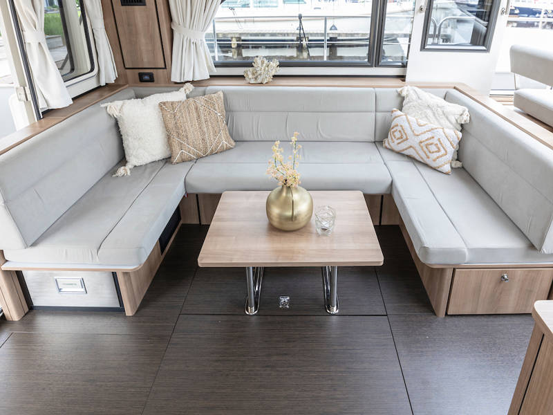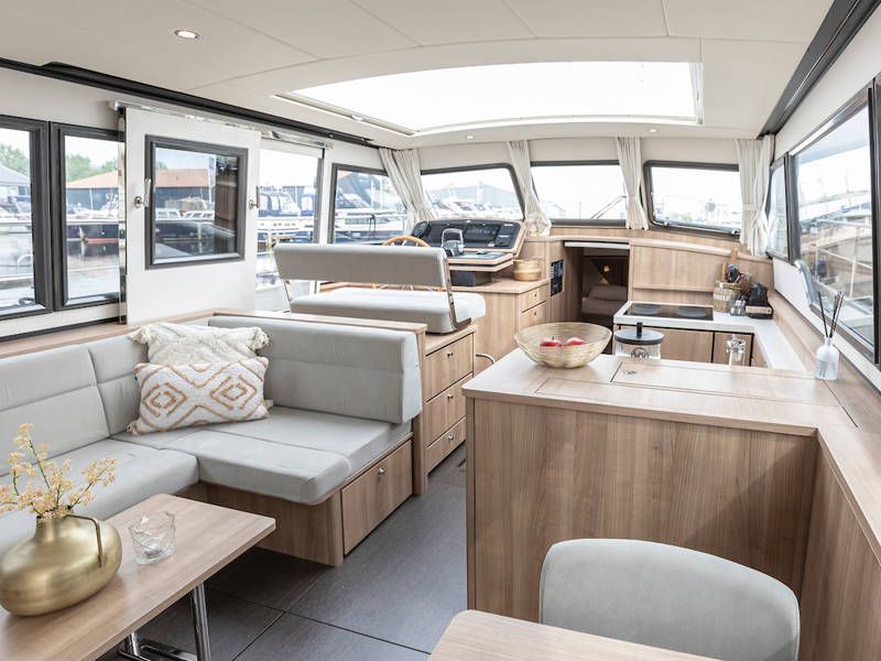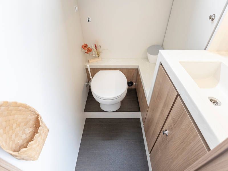 Die Yacht ist mit zwei Schlafkabinen, zwei Badezimmer, 1 grosse Duschen und zwei Toiletten ausgestattet, natürlich elektrisch. Der Salon ist mit einem Easy-Sleep-System ausgestattet, mit dem Sie im Handumdrehen ein Doppelbett machen können.