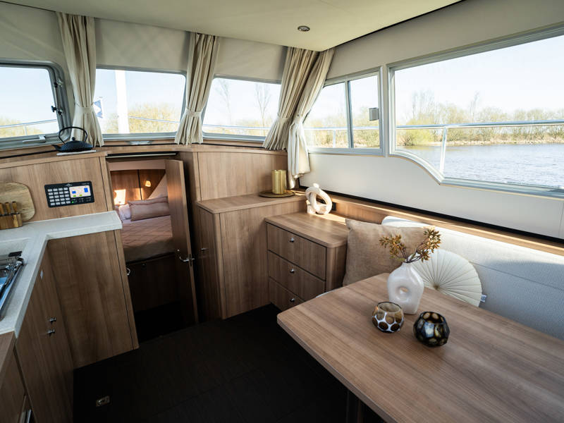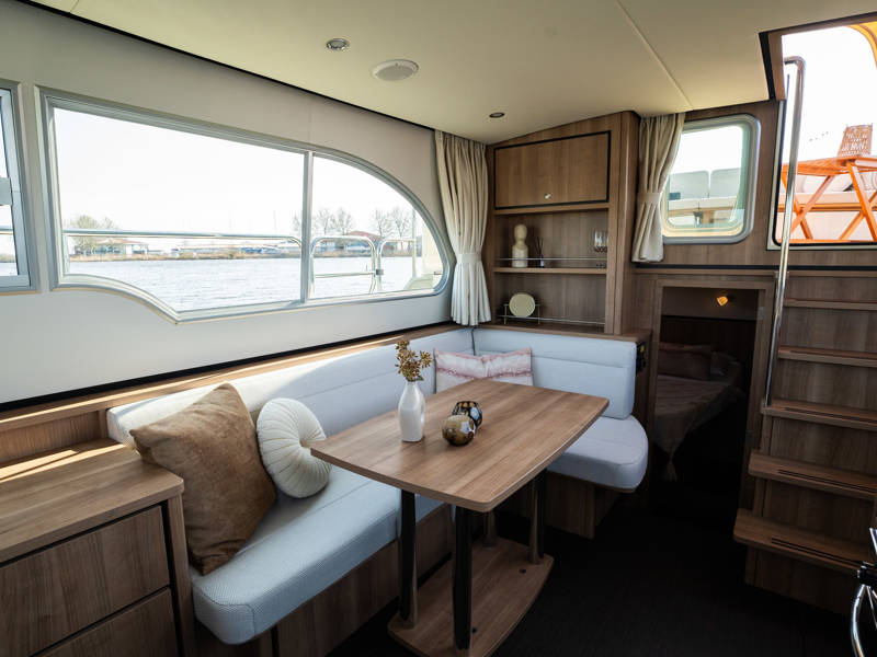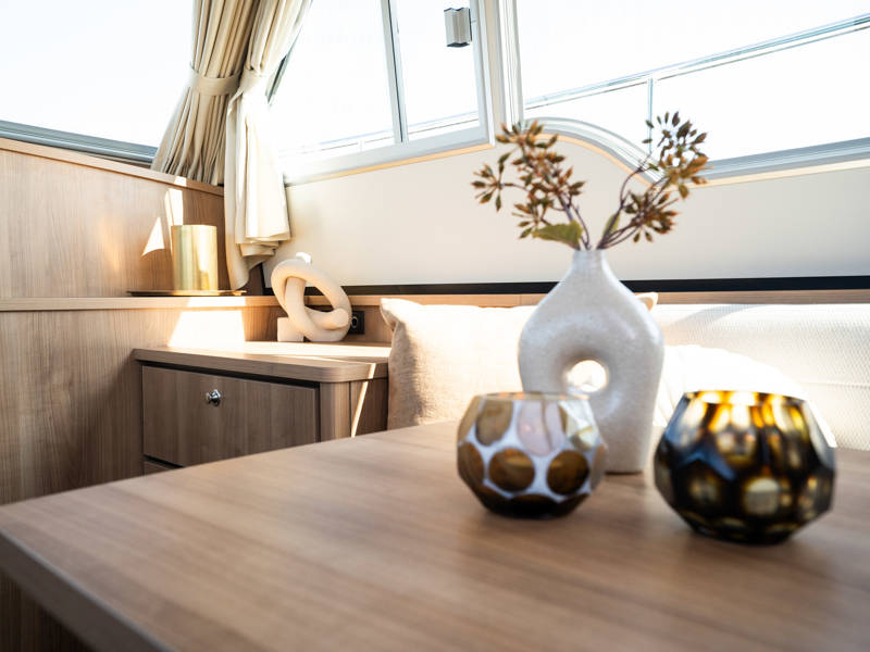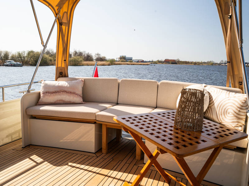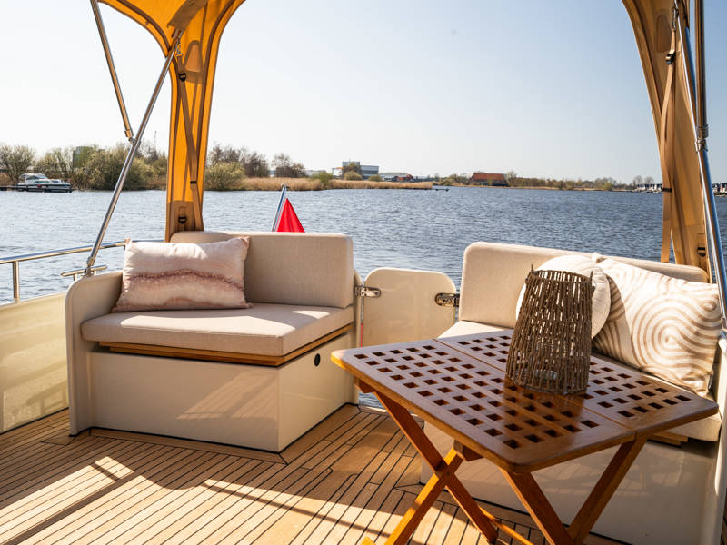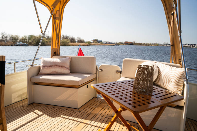 An Deck gibt es reichlich Sitzgelegenheiten auf der festen Bank mit feinen Kissen, und das Achterdeck kann rund um die Bank mit einem extragroßen Cabrio-Zelt komplett geschlossen werden.