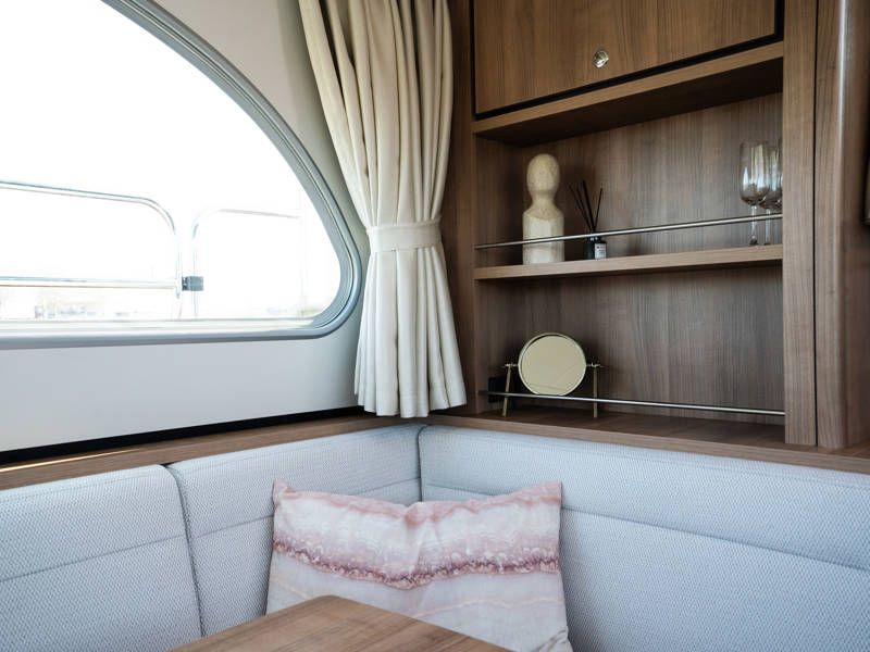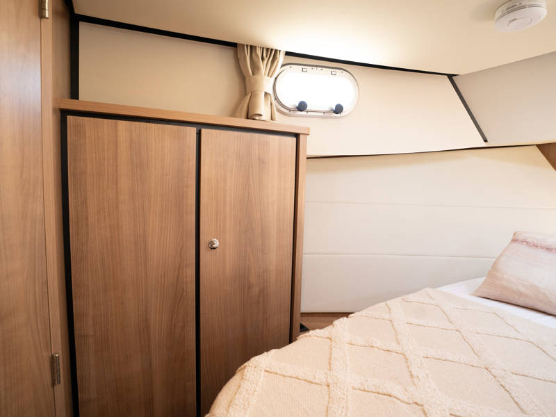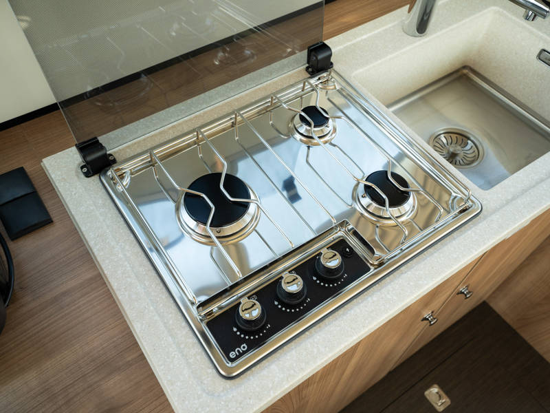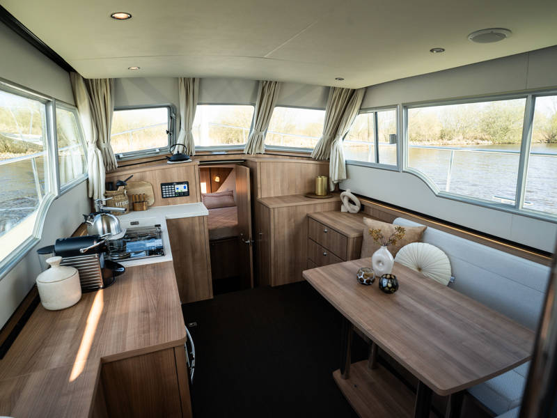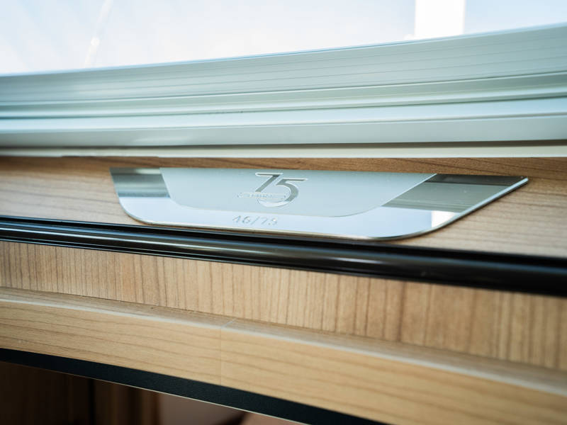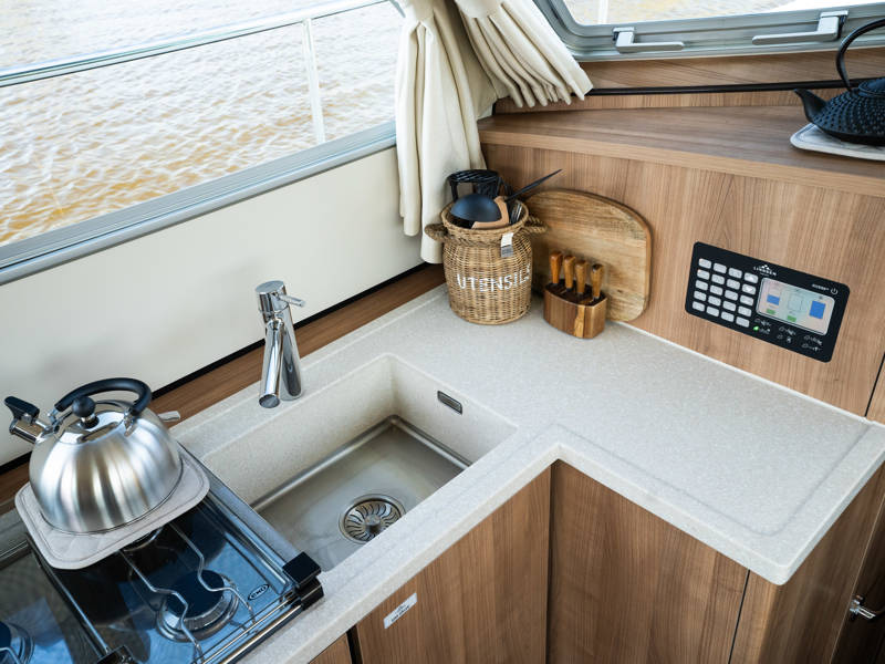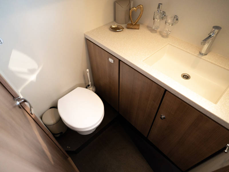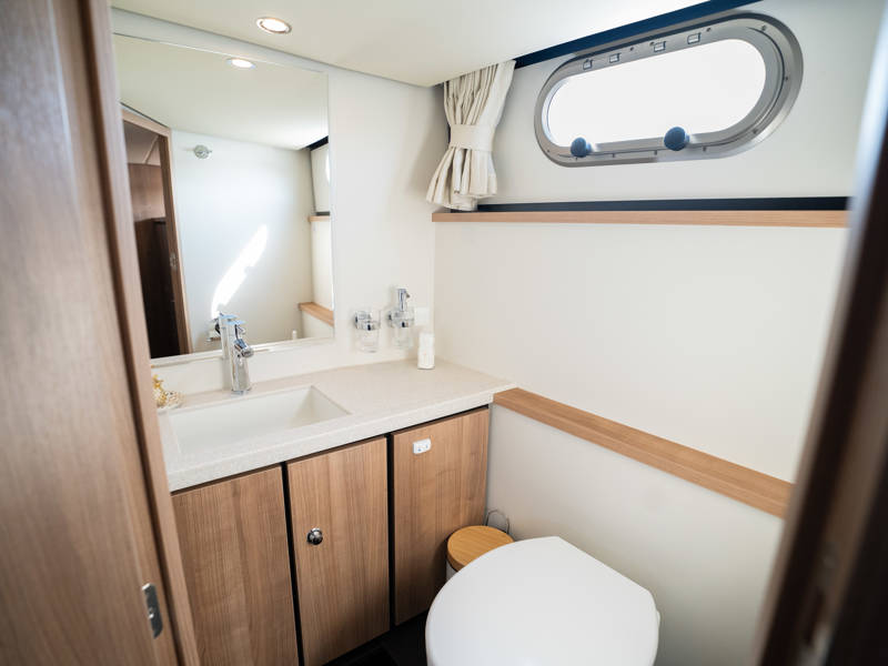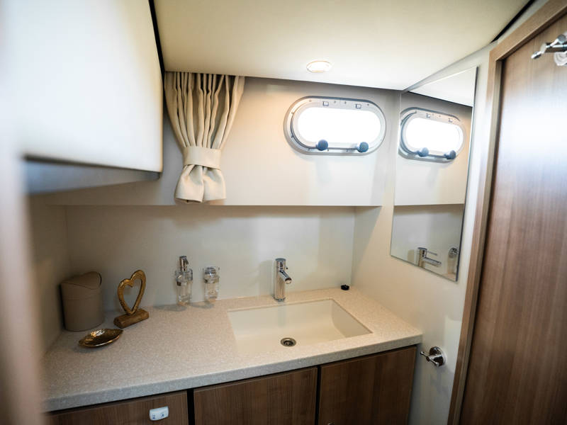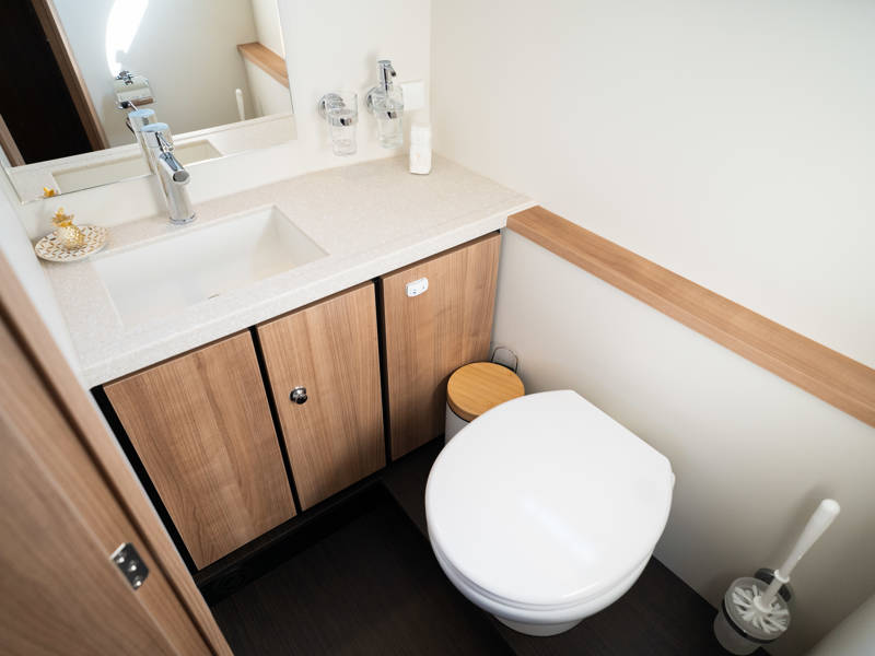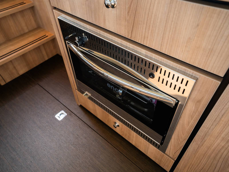 Das Interieur zeichnet sich durch eine raffinierte Aufteilung aus, die aus luxuriösen und hellen Materialien wie Corian-Platten und Leder in einer geschmackvollen Farbgebung besteht. Der geräumige Salon enthält eine voll ausgestattete Küche und eine komfortable Sitzecke mit TV.