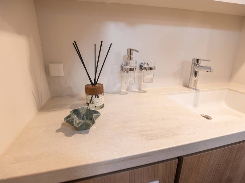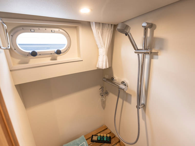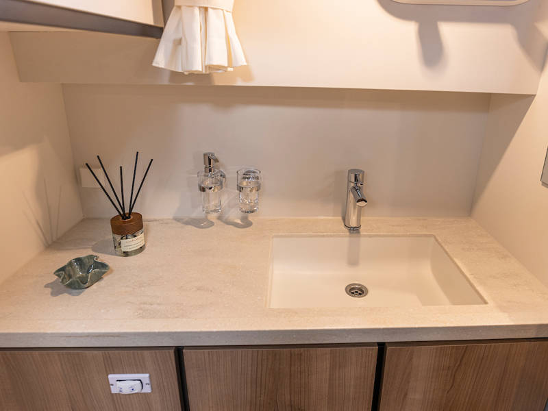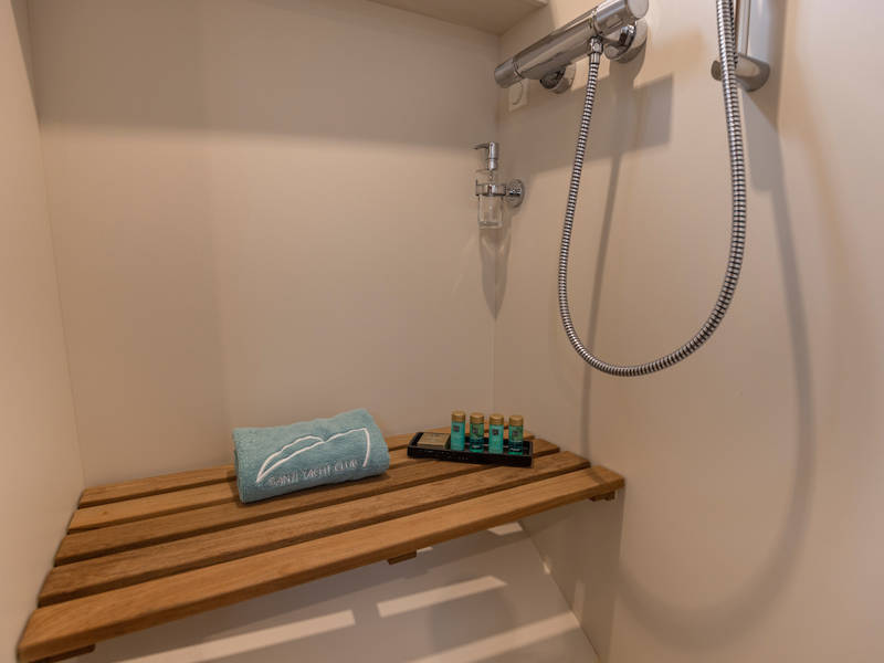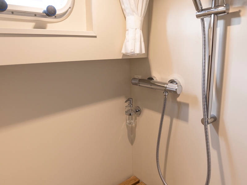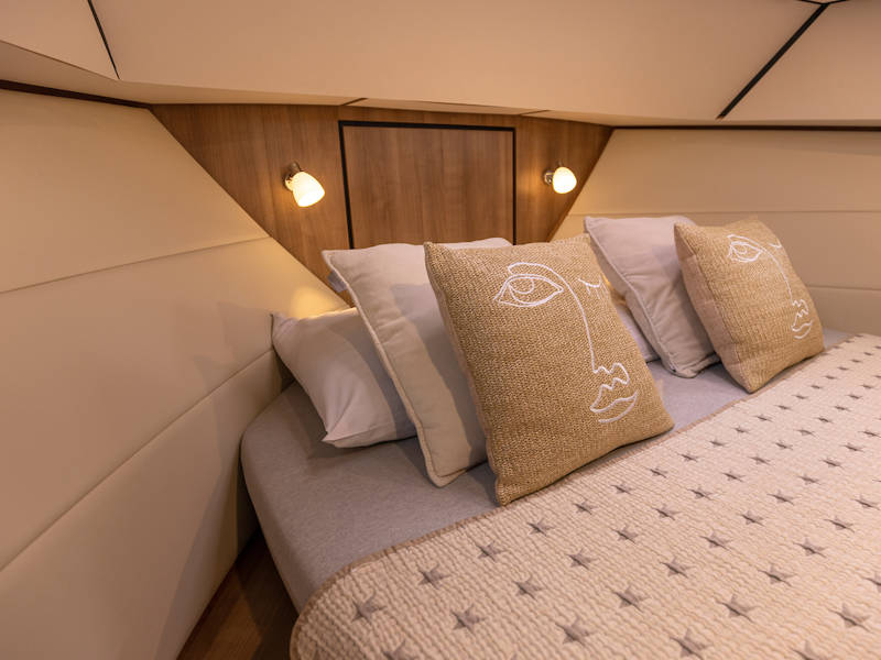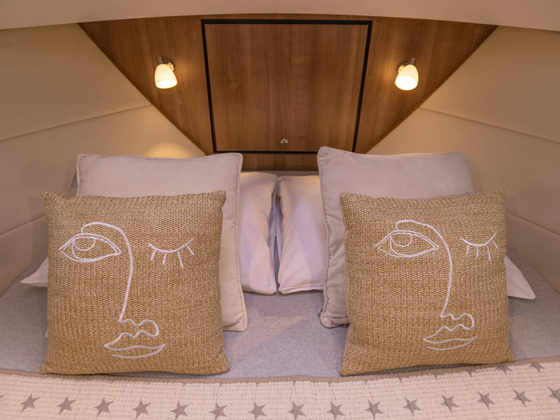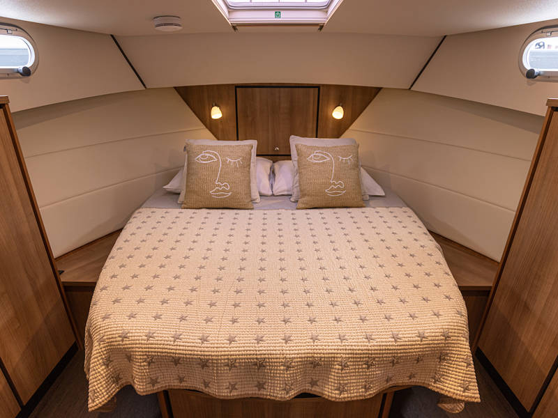 Das Platzangebot auf dieser kompakten Yacht ist überraschend groß! Im Vorschiff gibt es eine gemütliche Kapitänskabine mit einem Doppelbett, ein Badezimmer mit elektrischer Toilette und Waschbecken sowie eine separate Nasszelle mit Dusche.