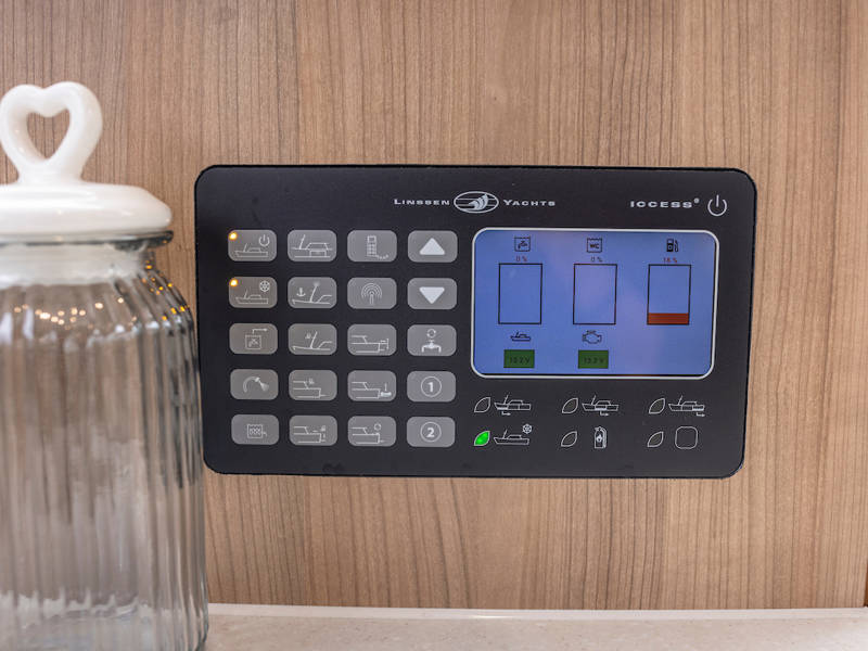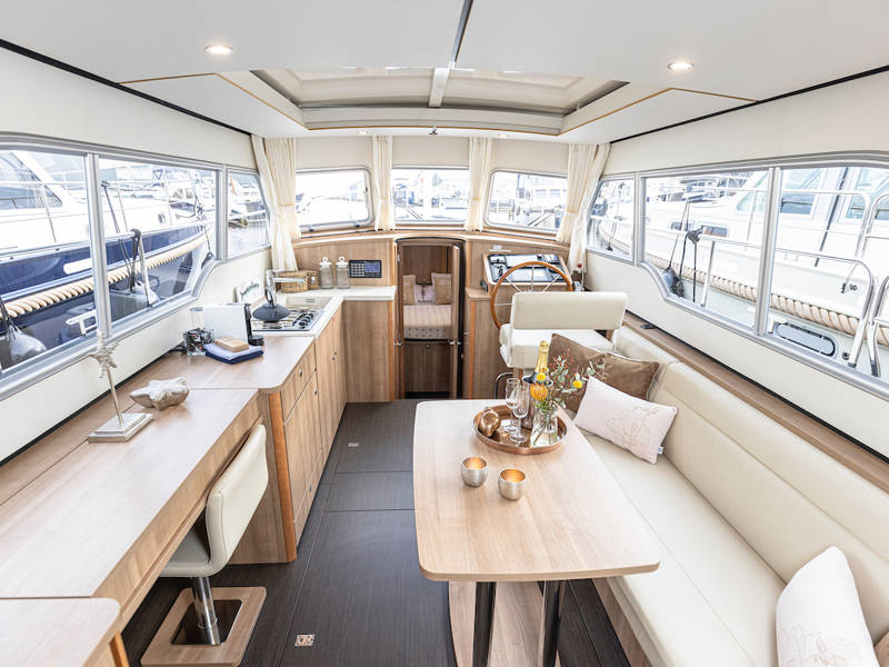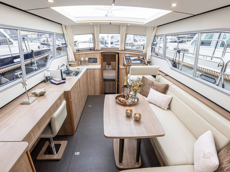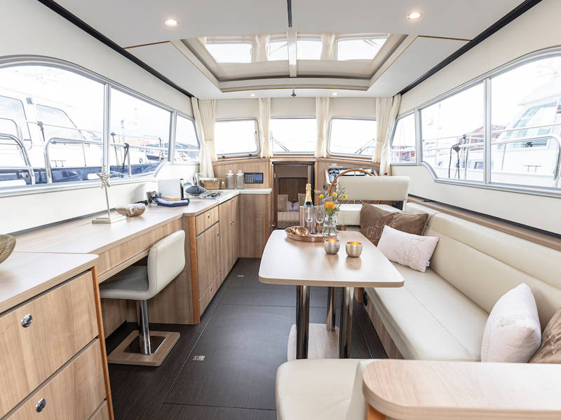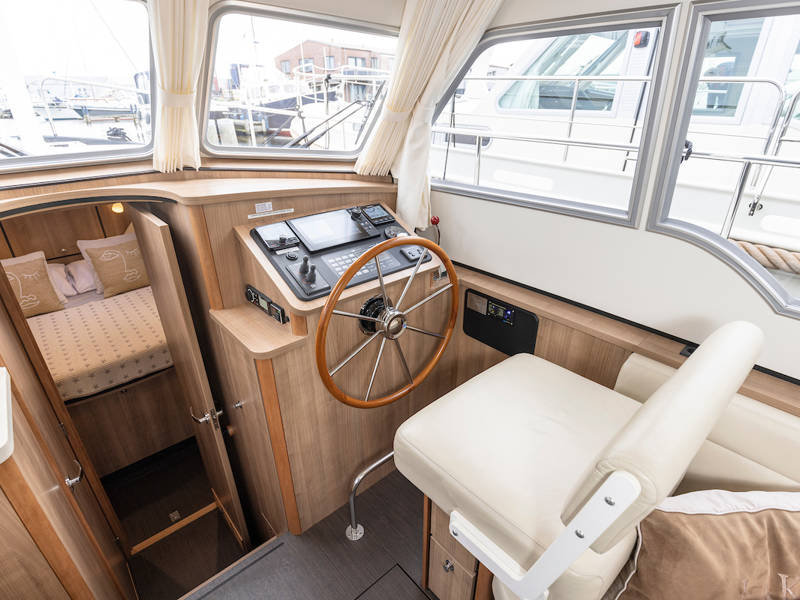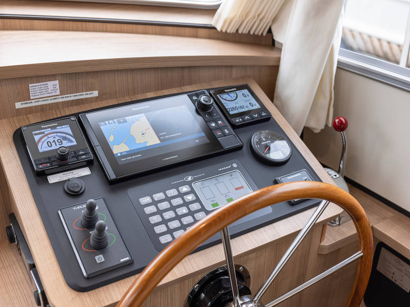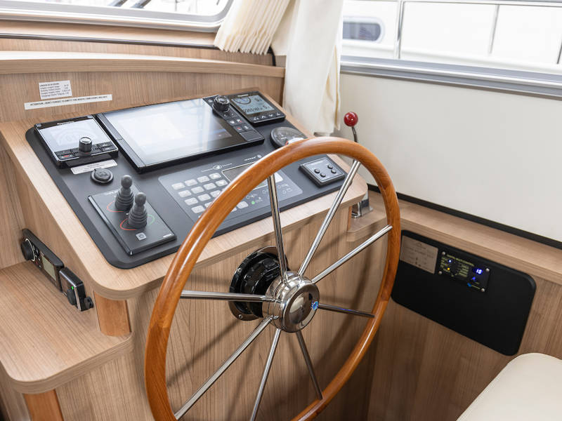 Auf der Steuerbordseite befinden sich der Steuerstand und das Armaturenbrett, das mit einem kompletten Navigationspaket ausgestattet ist. Über der Küche und dem Steuerstand befindet sich eine schiffsbreite Schiebeluke, die das „Außensteuergefühl“ unterstreicht.