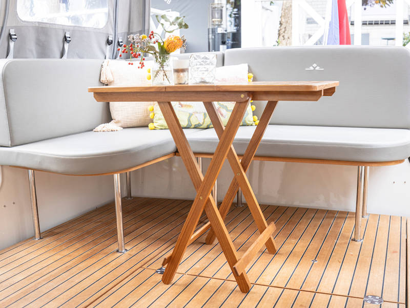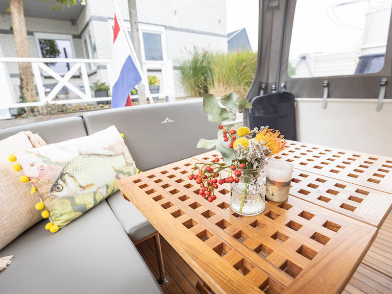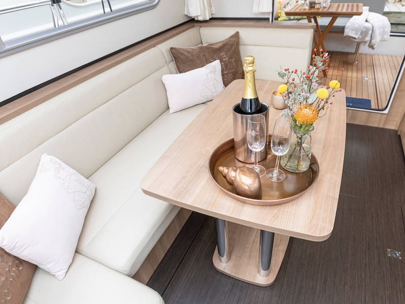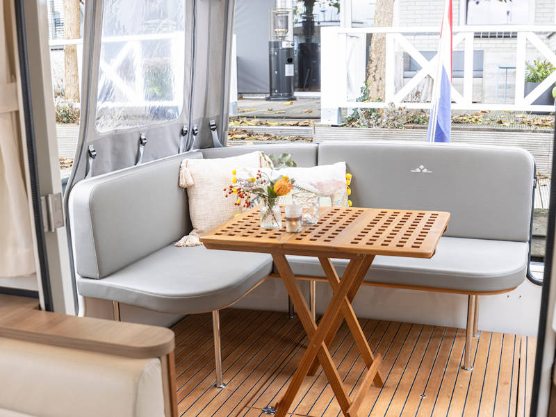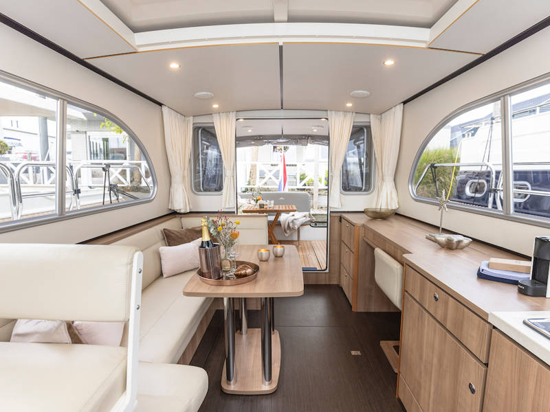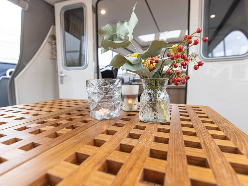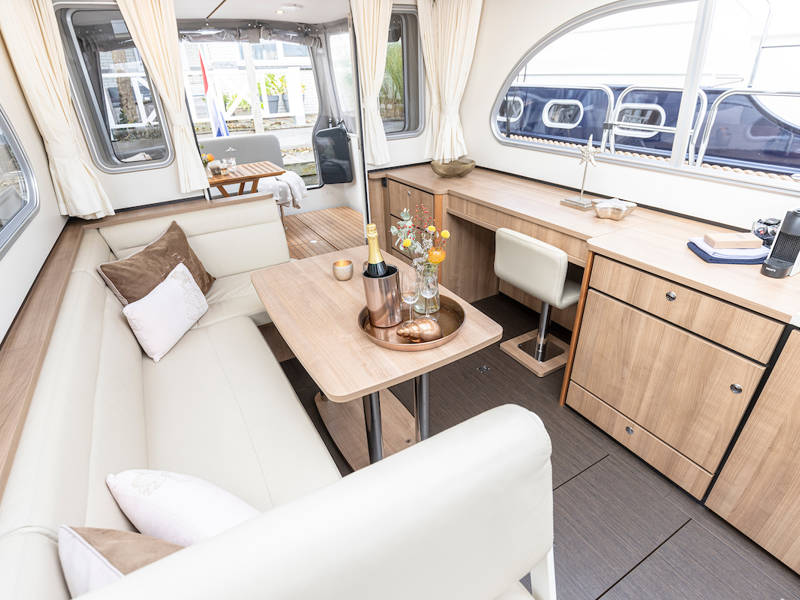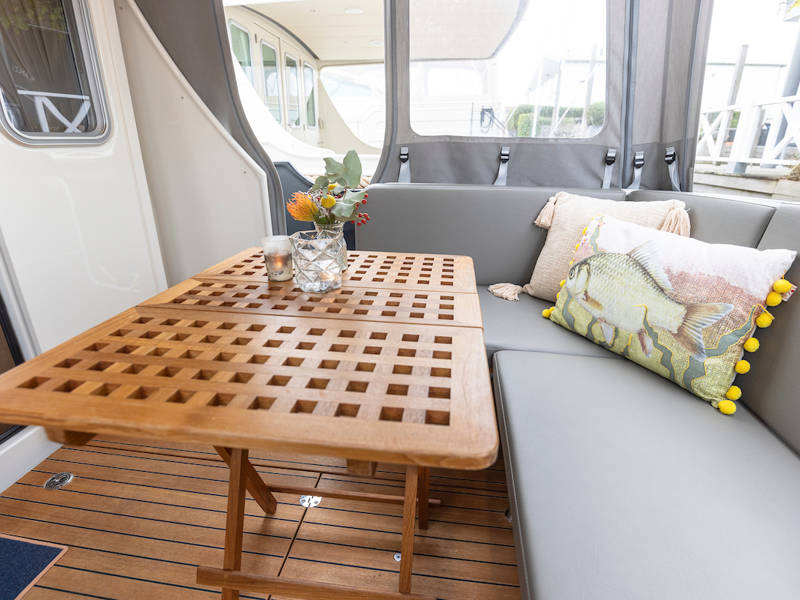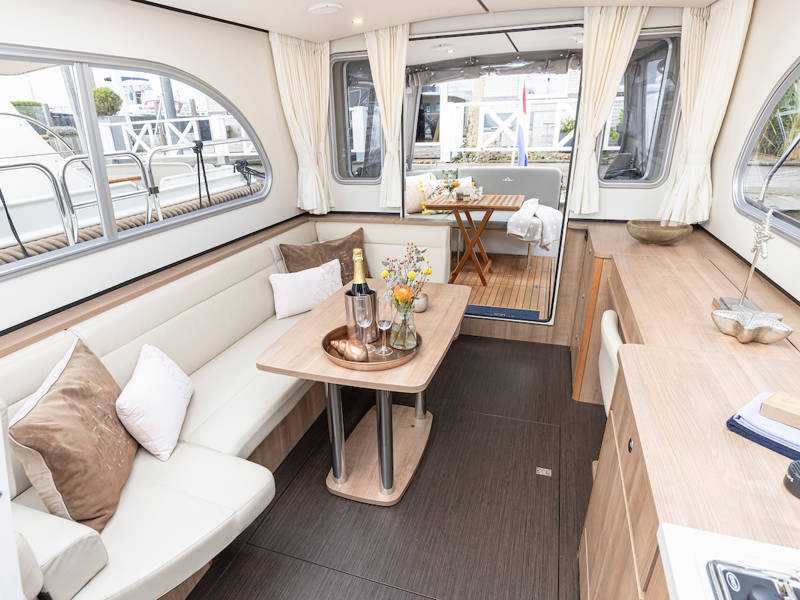 Der Salon ist mit großen Schiebetüren ausgestattet, die den Zugang zum offenen Cockpit mit einer großzügigen Sitzbank ermöglichen. Dieses Cockpit ist abschließbar und beheizbar, für viele gemütliche Stunden an Bord.