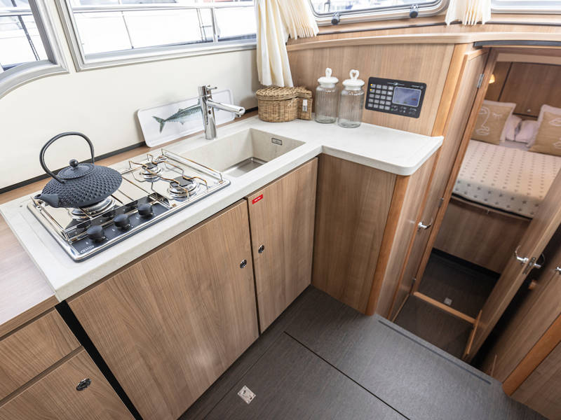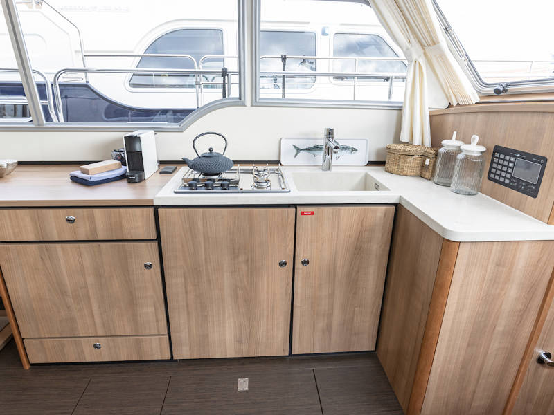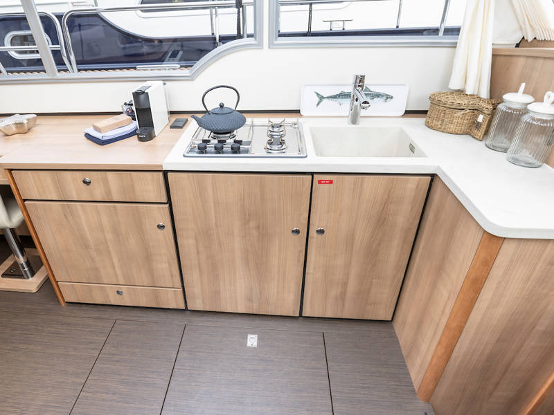 Die Küche befindet sich auf der Backbordseite und ist komplett ausgestattet mit einem Herd, einer Nespresso-Maschine und einem kompletten Kücheninventar.