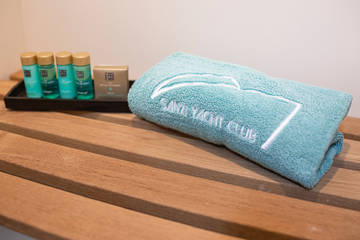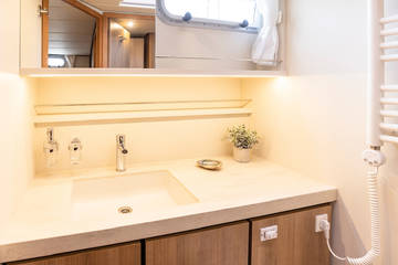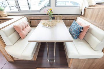 Der Innenraum zeichnet sich durch eine raffinierte Gestaltung aus hellem Holz und luxuriösen Materialien wie Corian-Platten und Leder in einer hellen, geschmackvollen Farbgebung aus. Gegenüber der Küche befindet sich ein schöner Essbereich (Essecke) mit viel Licht. Eine Nespresso-Maschine ist an Bord vorhanden.