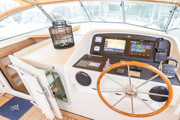 Übrigens kann das Cabrio im Sommer teilweise abgenommen werden. Die Linssen GS 40.0 Intero ist mit einem kompletten Navigationspaket (Raymarine, Plotter, Autopilot + Ray 90 UKW-Funkgerät) ausgestattet.