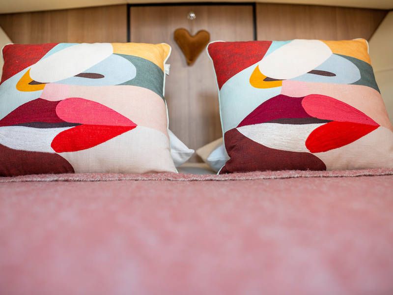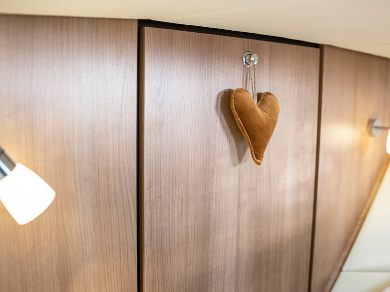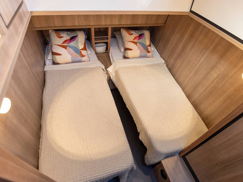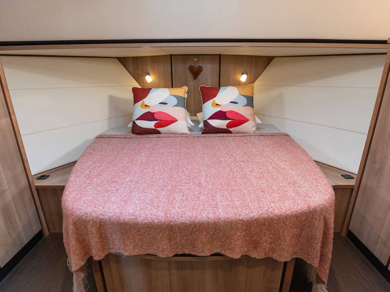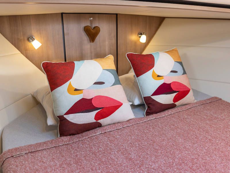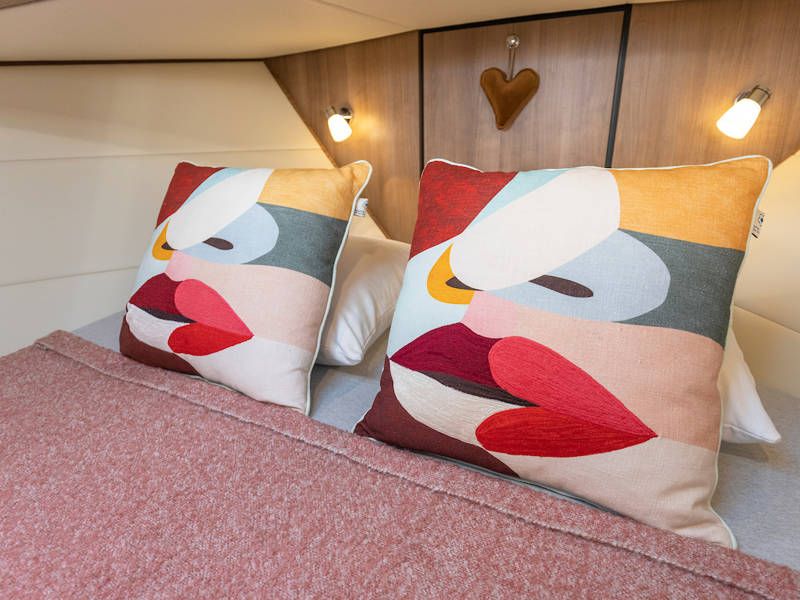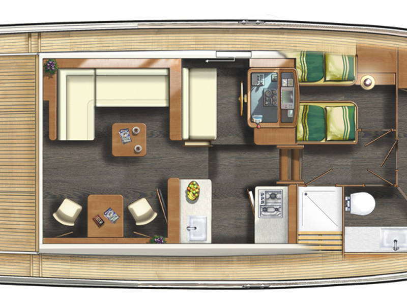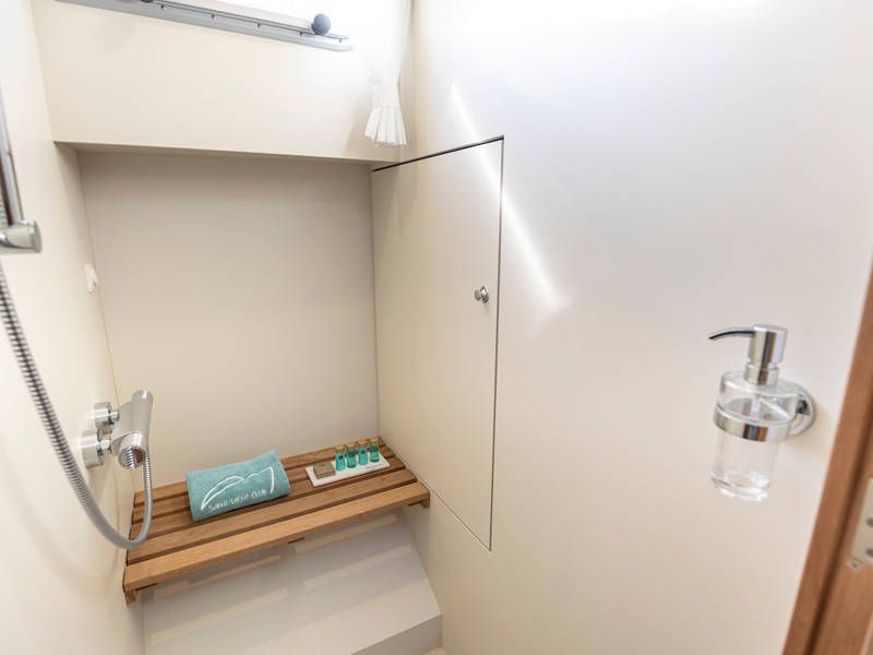 Das Boot is mit zwei Kabinen ausgestattet. Eine Kabine hat ein freistehendes Doppelbett und die andere Kabine hat 2 Einzelbetten. Es gibt auch ein sehr geräumiges Badezimmer mit einer Toilette und einer separaten Großen Dusche an Steuerbord.
