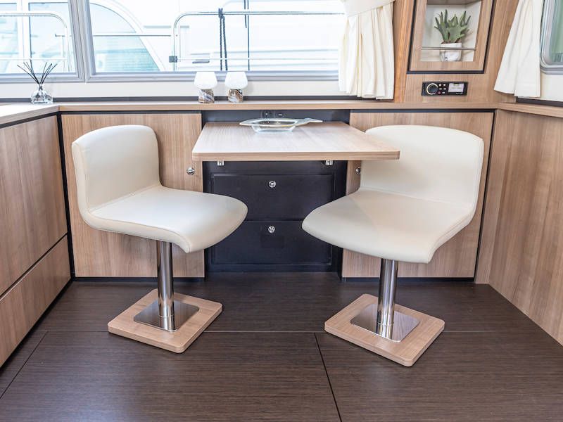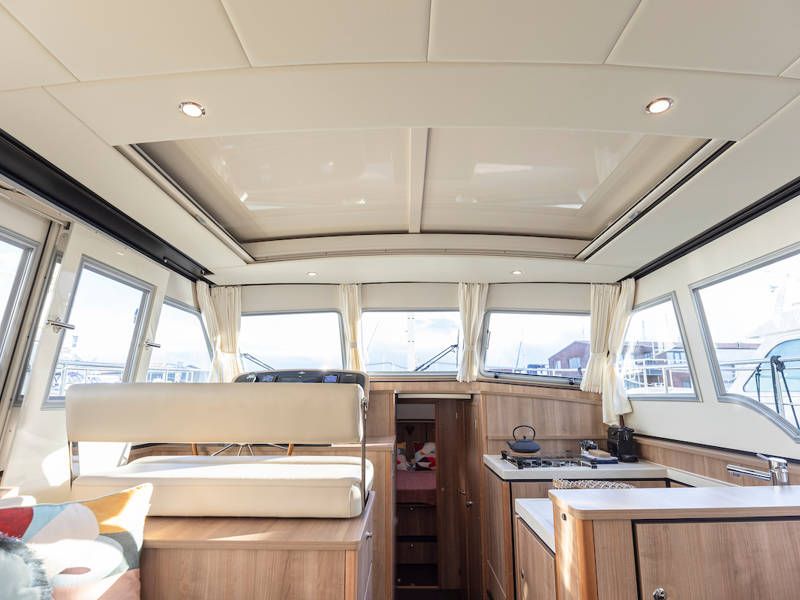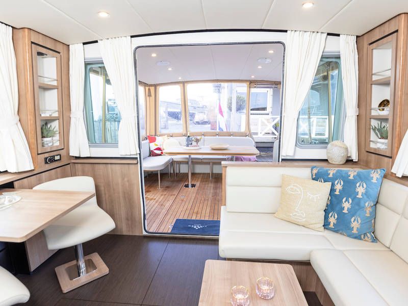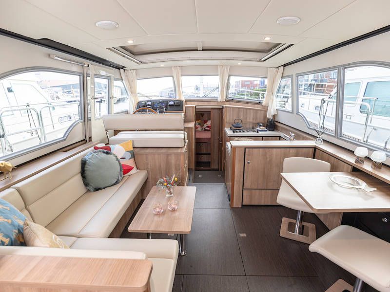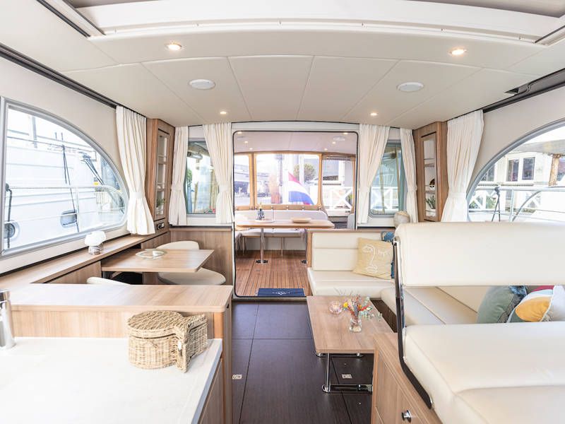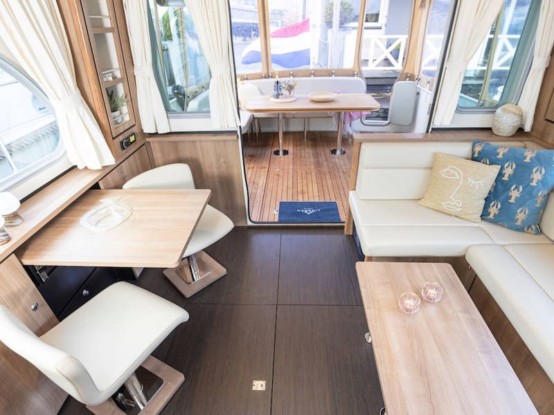 Im Cockpit befindet sich eine schöne, geräumige Couch und ein Esstisch. Das offene Cockpit hat ein durchgehendes langes Verdeck mit stimmungsvoller Beleuchtung. Das Cockpit kann komplett geschlossen werden, so dass der Salon verlängert wird.