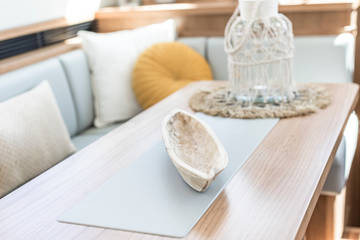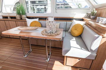 Der helle Salon bildet das Herz der Yacht und lädt zum gemeinsamen Verweilen ein. Gegenüber der Essecke befindet sich die großzügig ausgestattete Küche, die allen Komfort bietet, den man auch von zu Hause kennt. Die hochwertige Verarbeitung und das warme Interieur schaffen eine entspannte und luxuriöse Atmosphäre an Bord.