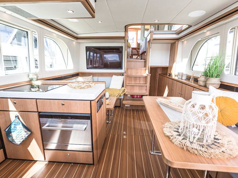 Chic, das ist sicher der Linssen Grand Sturdy 450 Variotop! eine extrem stilvolle Yacht, großzügig angelegt mit zwei schönen geräumigen Kabinen.