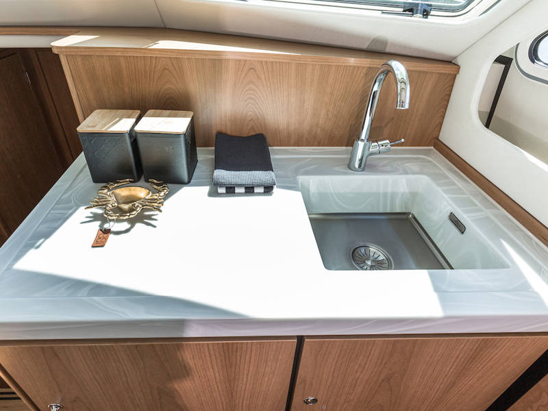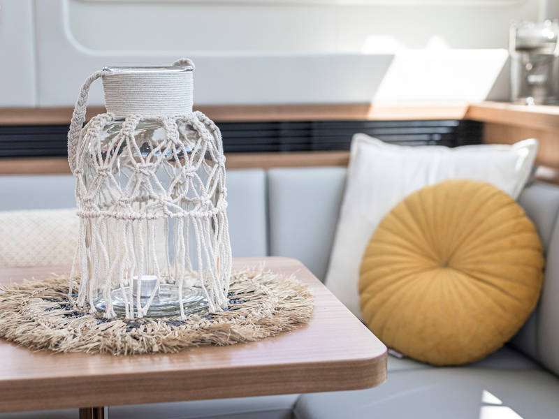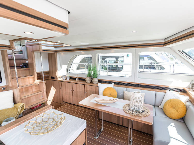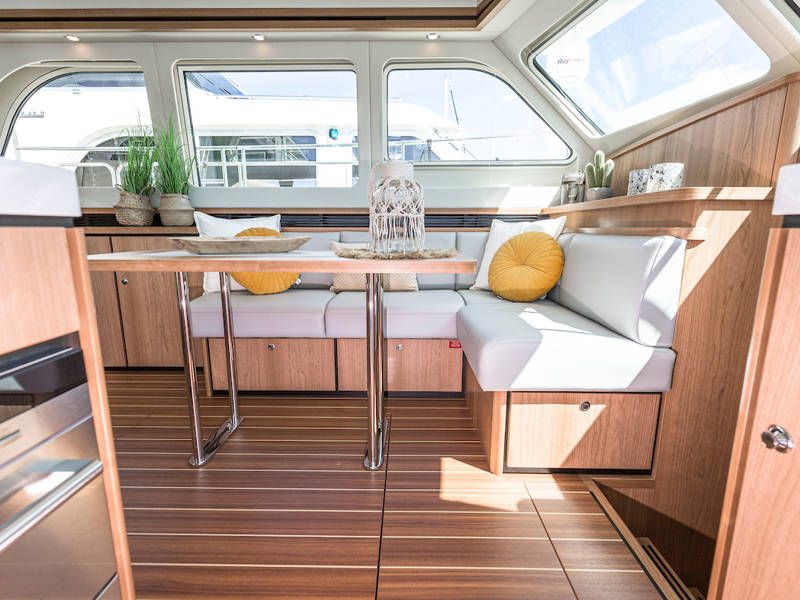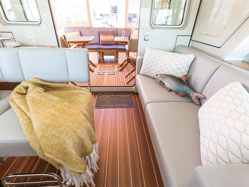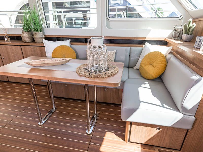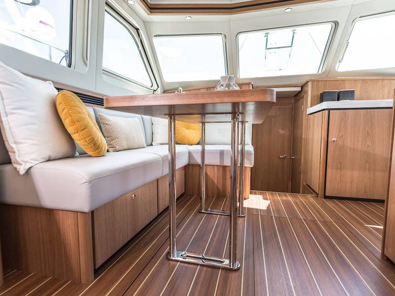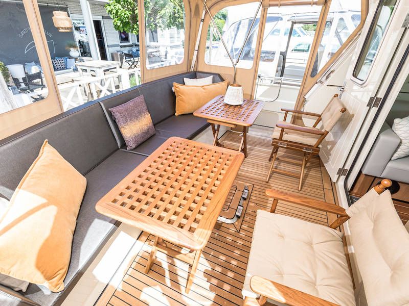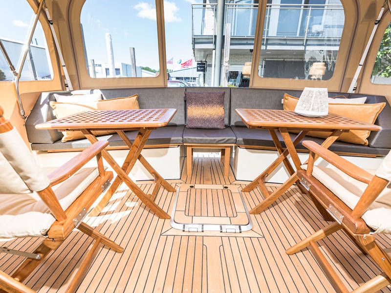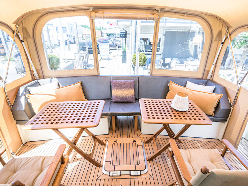 Auf dem Achterdeck befindet sich ein großes festes Sofa und ein Esstisch aus Teakholz. Dieser Teil der Yacht kann mit einem Cabrio-Zelt ganz geöffnet oder ganz geschlossen werden.