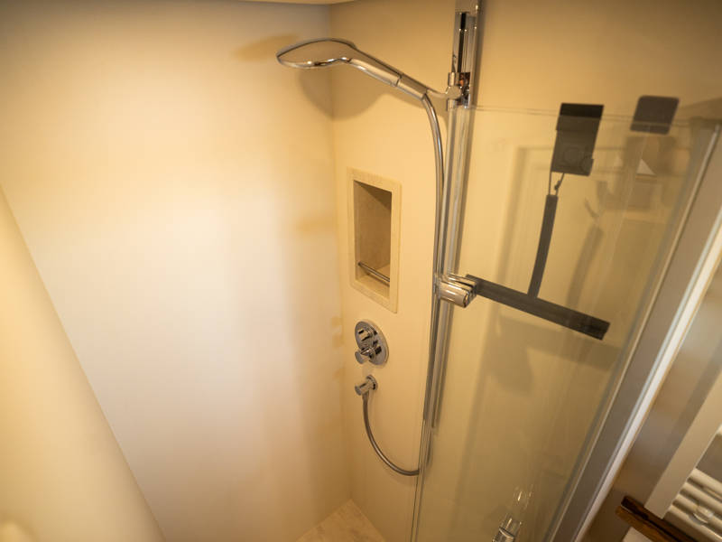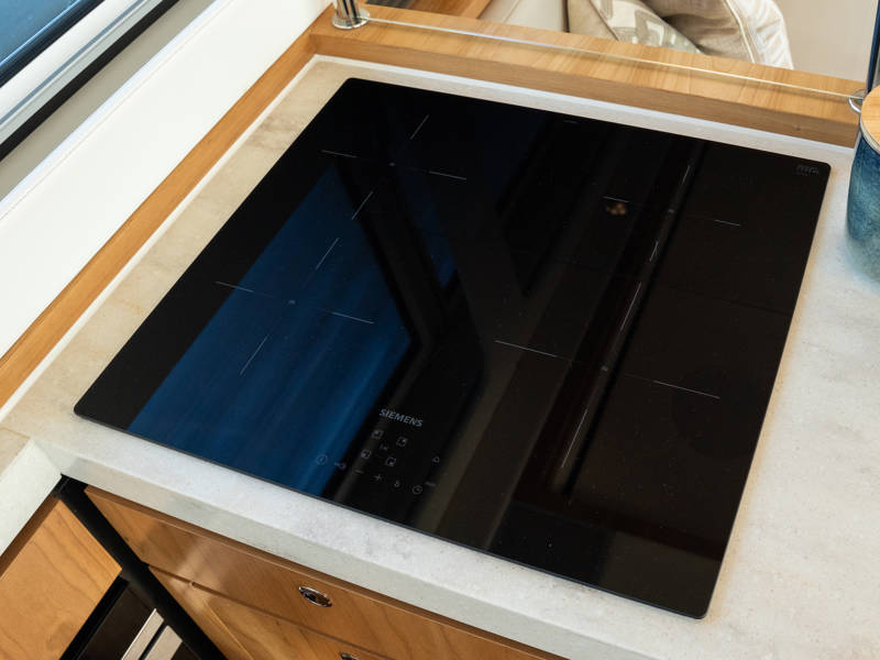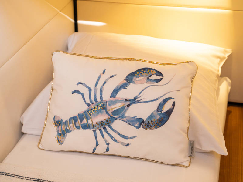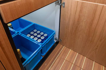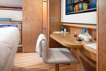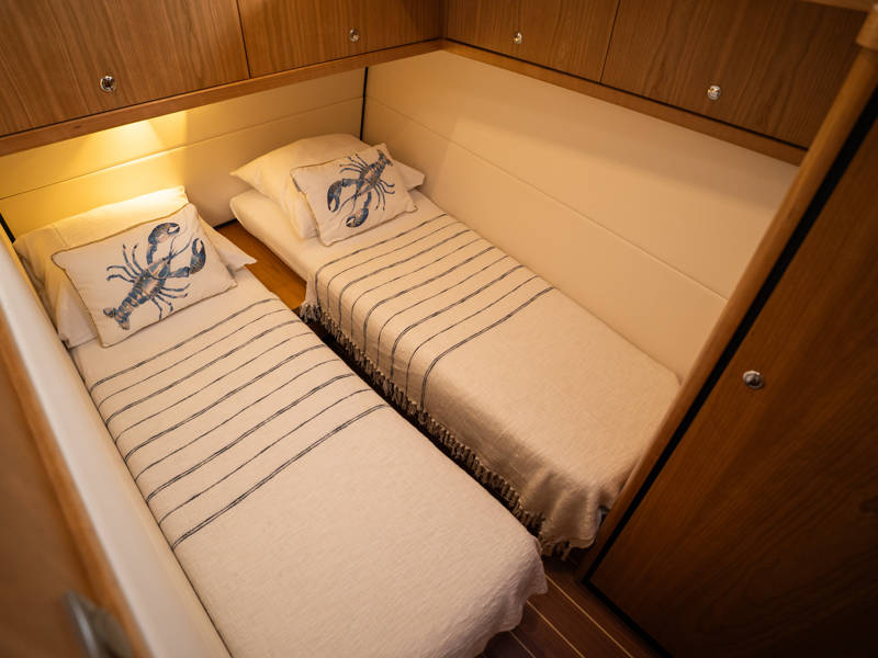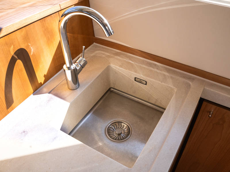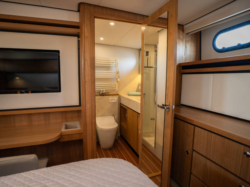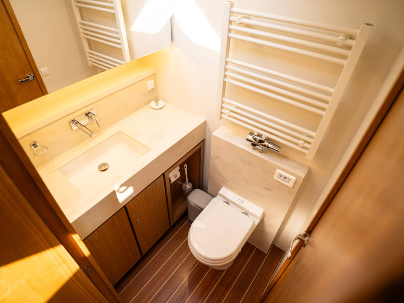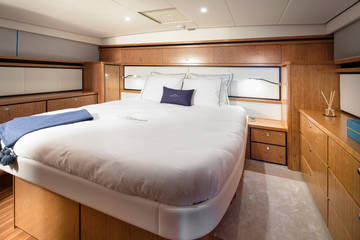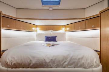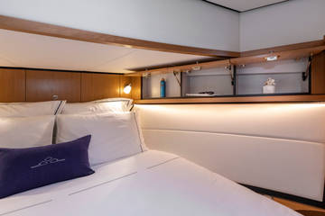 Unter Deck befinden sich zwei geräumige 2-Personen-Schlafkabinen, zwei Bäder und zwei Toiletten. Und eine zusätzliche dritte Kabine mit 2 Einzelbetten. Eine voll ausgestattete Küche mit Kombi-Backofen, Geschirrspüler, Induktionsherd und integrierter Luxus-Espressomaschine vervollständigen das Luxus-Erlebnis. Das Blue Sky ist mit einer Klimaanlage ausgestattet.