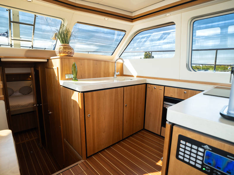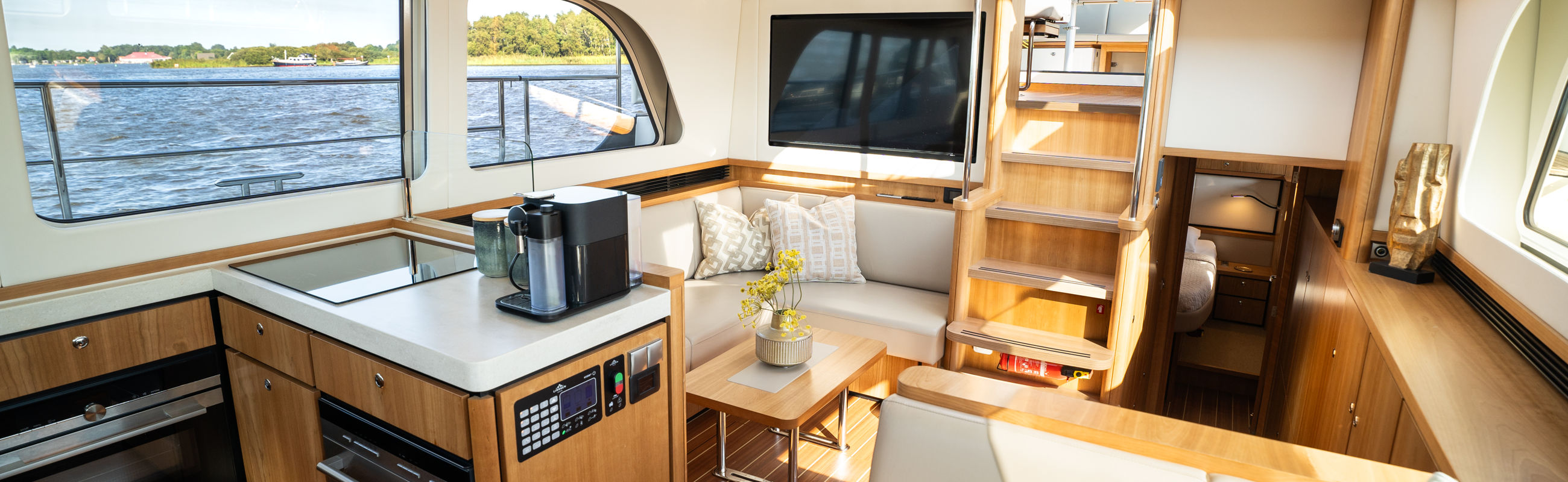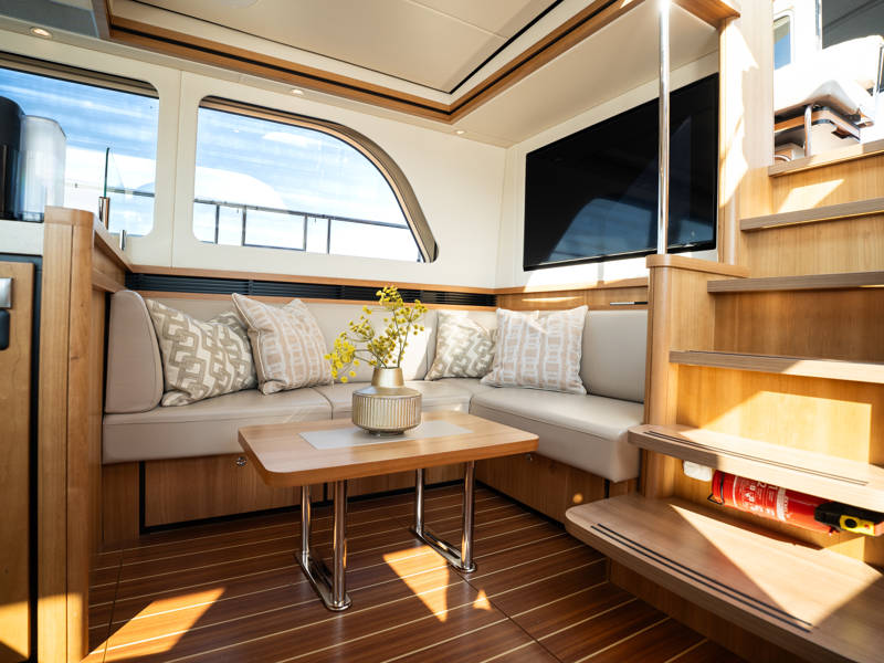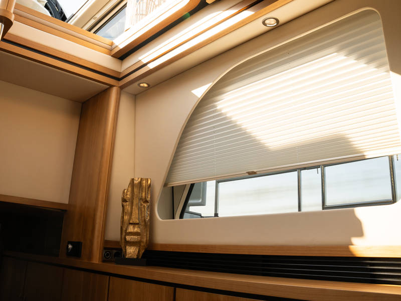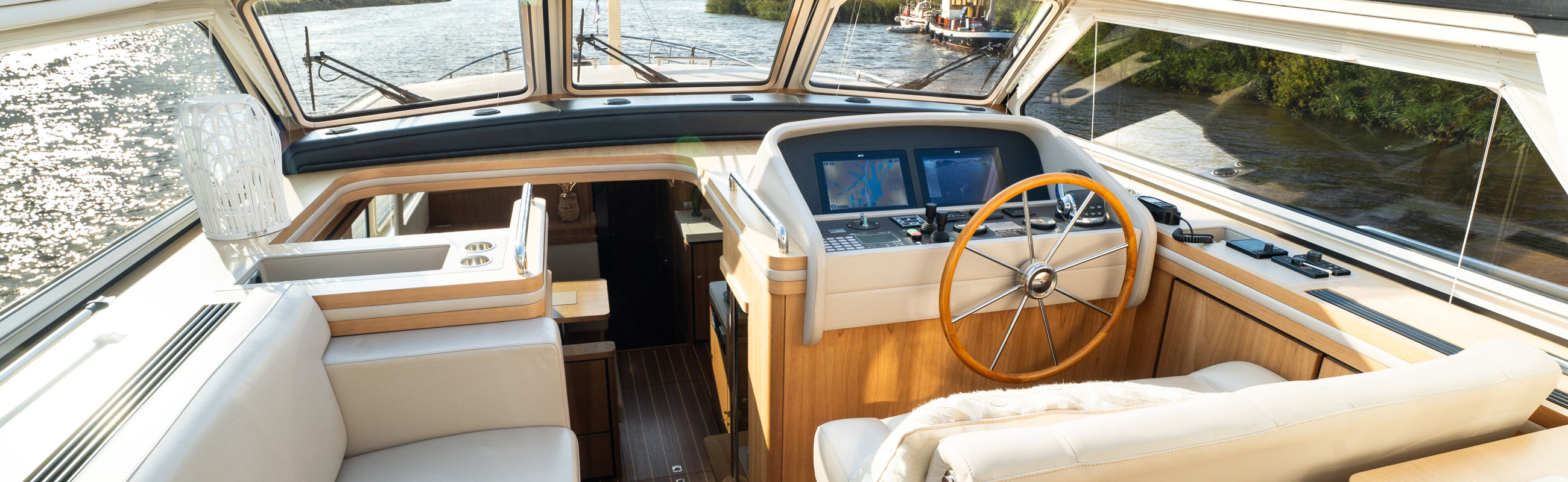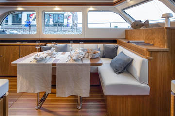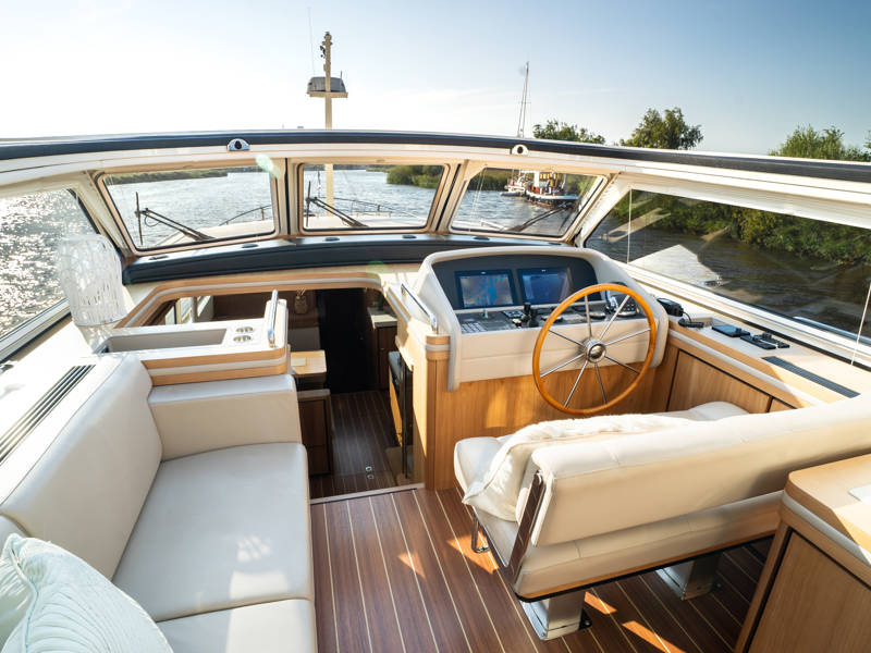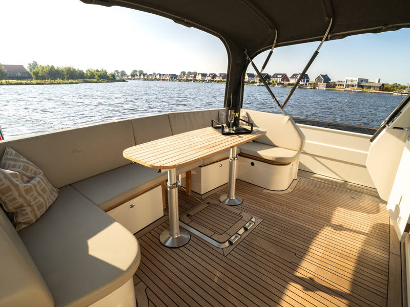 Das elektrisch bedienbare Variotop befindet sich oberhalb der Steuerbank. Im Steuerhaus gibt es genügend Sitzgelegenheiten und eine kleine Küche mit einem zusätzlichen Kühlschrank. Dieser Teil des Bootes kann mit massiven Türen komplett abgeschlossen werden und ist beheizbar. Außerdem gibt es auf dem Achterdeck einen geräumigen Sitzbereich mit einem höhenverstellbaren Tisch. Dieser Teil, das Achterdeck, kann auch mit einem Cabrioverdeck komplett geschlossen werden (nicht auf den Fotos zu sehen).