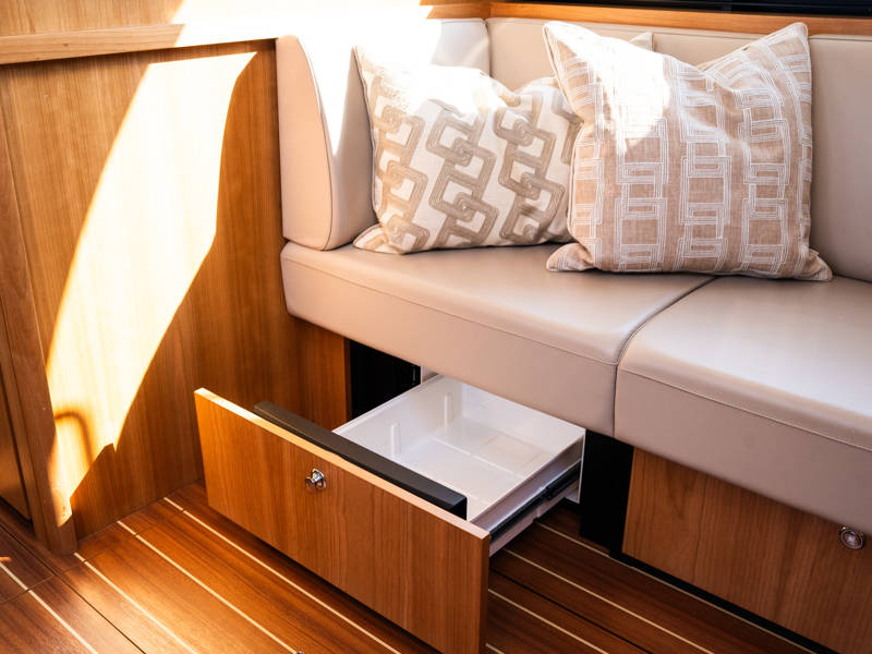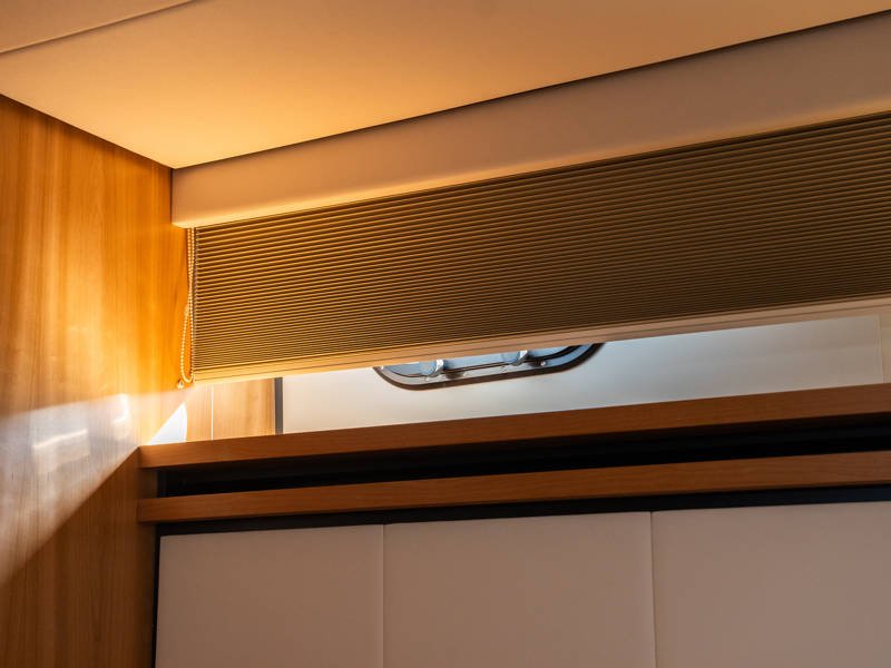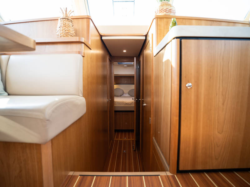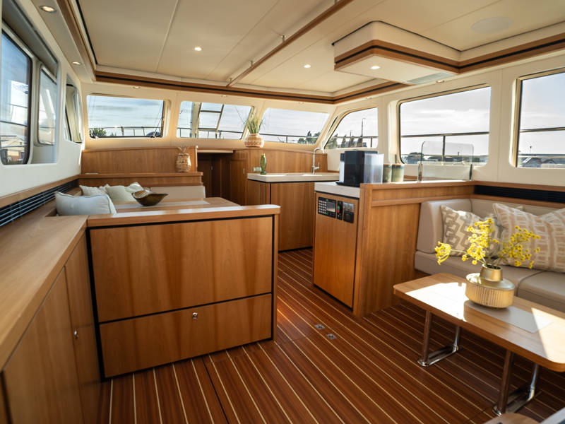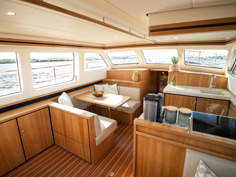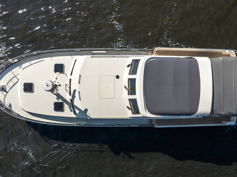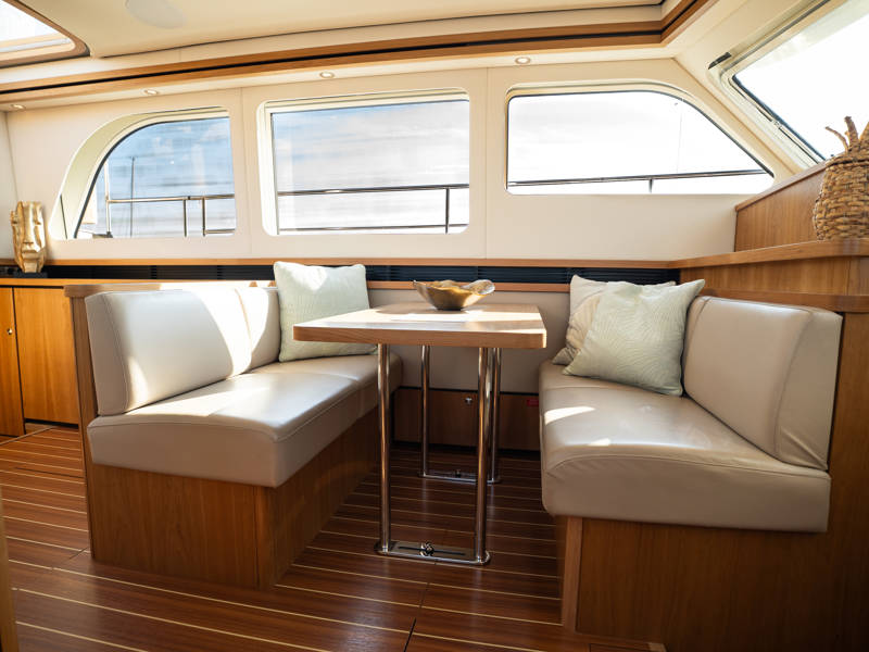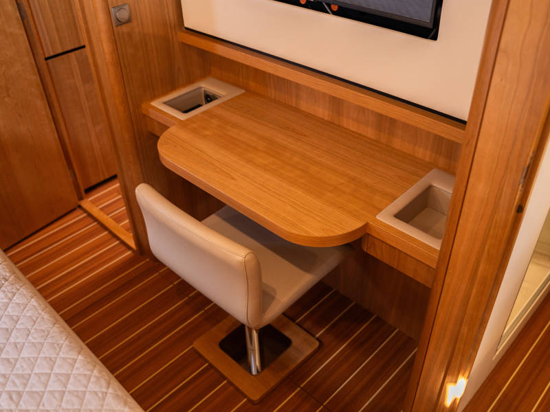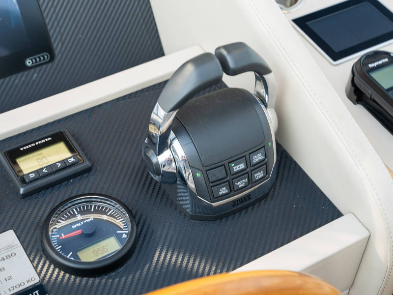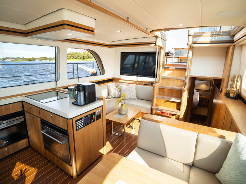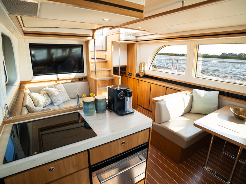 Das elektrisch bedienbare Variotop befindet sich oberhalb der Steuerbank. Im Steuerhaus gibt es genügend Sitzgelegenheiten und eine kleine Küche mit einem zusätzlichen Kühlschrank. Dieser Teil des Bootes kann mit massiven Türen komplett abgeschlossen werden und ist beheizbar. Außerdem gibt es auf dem Achterdeck einen geräumigen Sitzbereich mit einem höhenverstellbaren Tisch. Dieser Teil, das Achterdeck, kann auch mit einem Cabrioverdeck komplett geschlossen werden (nicht auf den Fotos zu sehen).