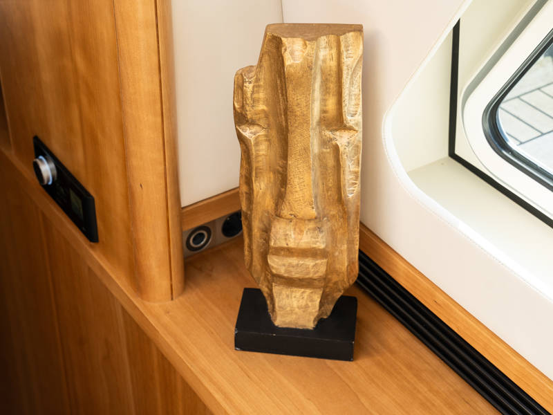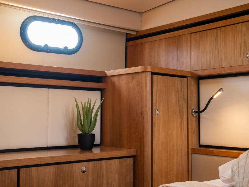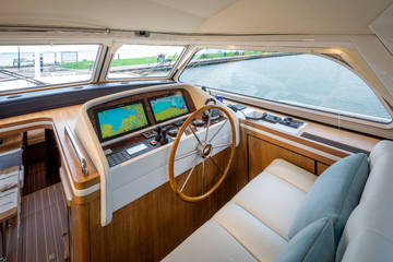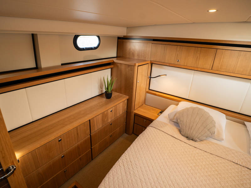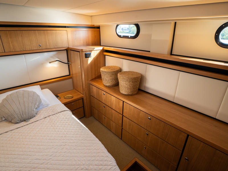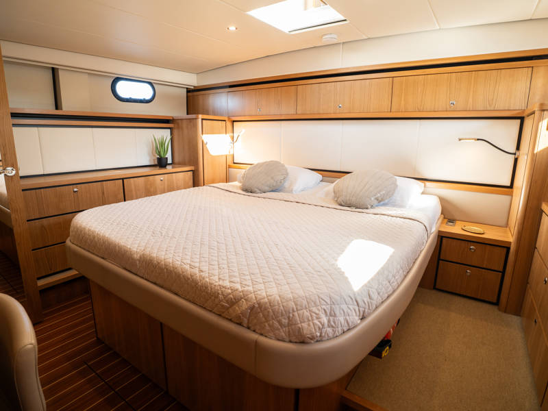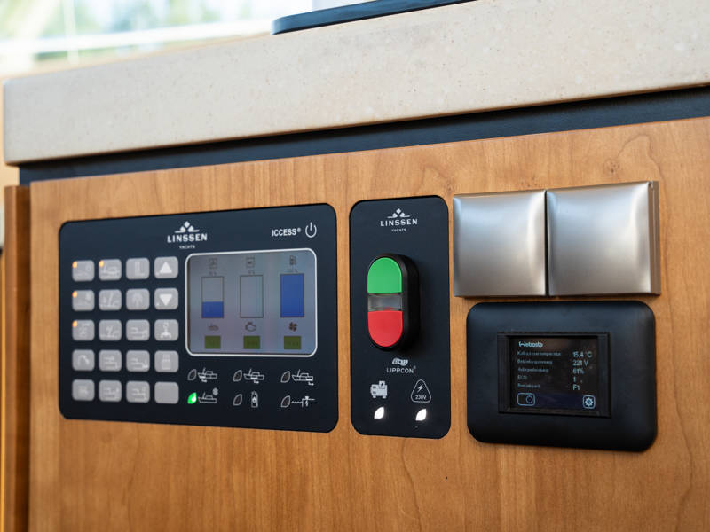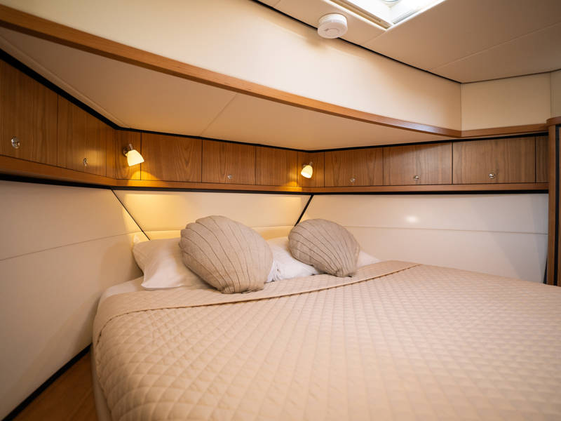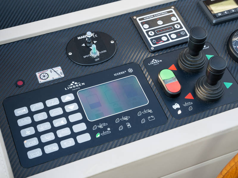 Der Grundriss ist ideal für 4 bis 6 Personen geeignet. Im Steuerhaus ist das Armaturenbrett mit allen erdenklichen Navigationsinstrumenten ausgestattet, und zusätzlich gibt es einen leistungsstarken Satz Stabilisatoren, so dass für diese robuste Linssen-Yacht jedes Fahrgebiet technisch möglich ist.