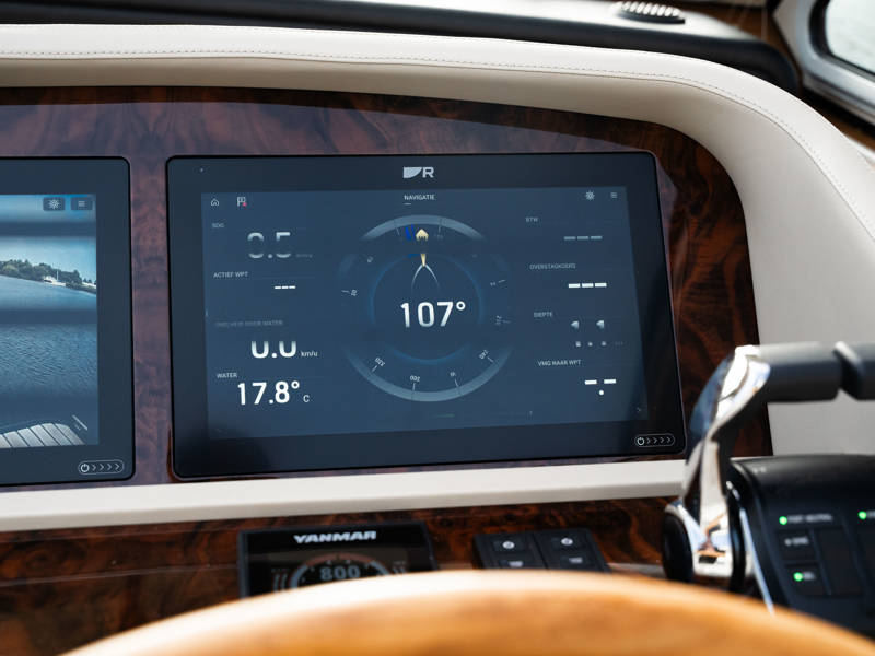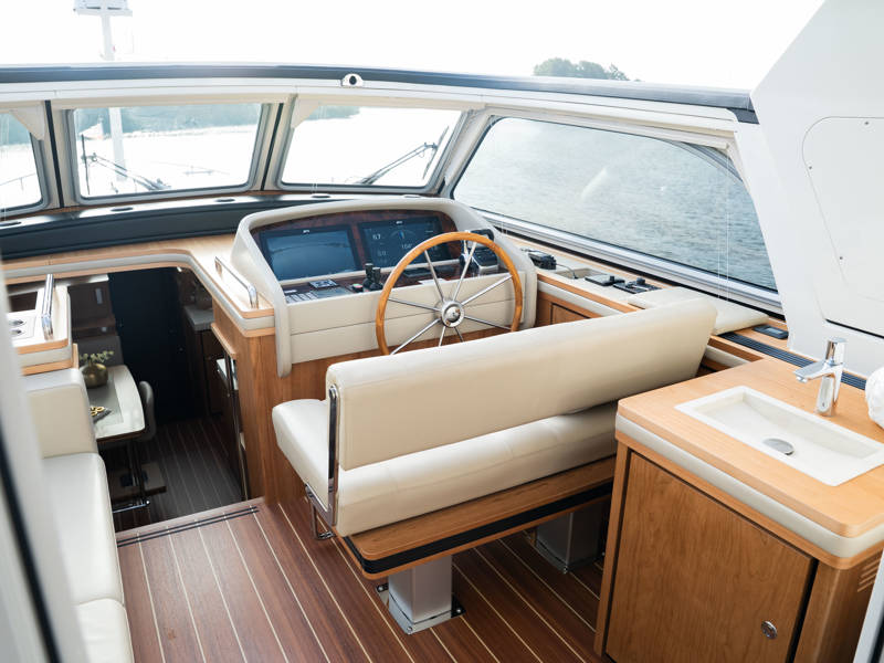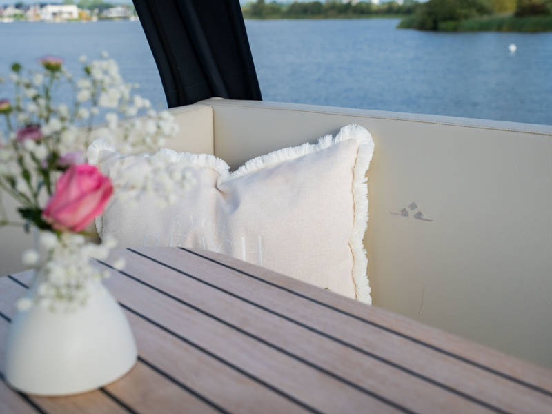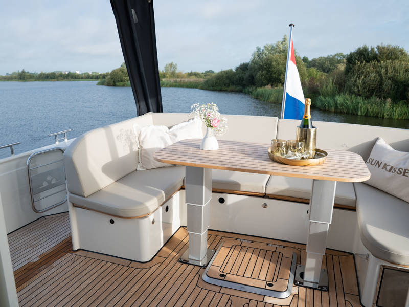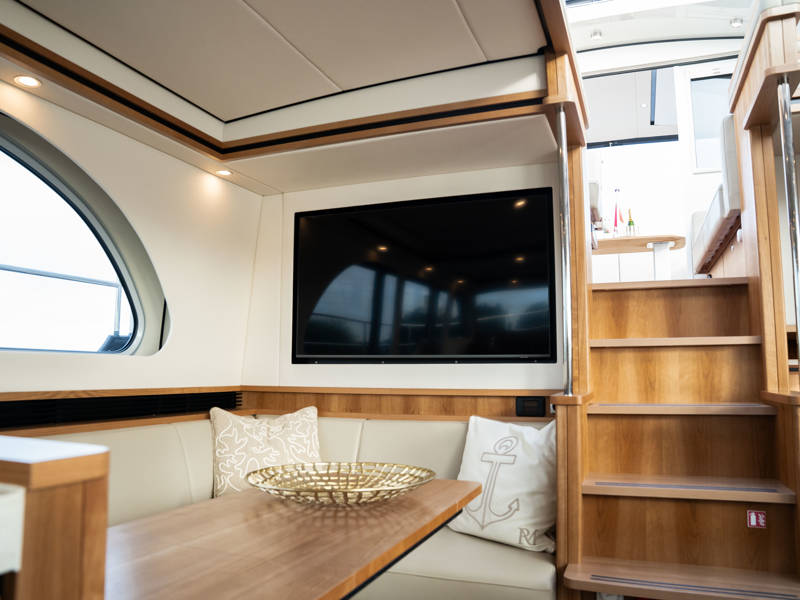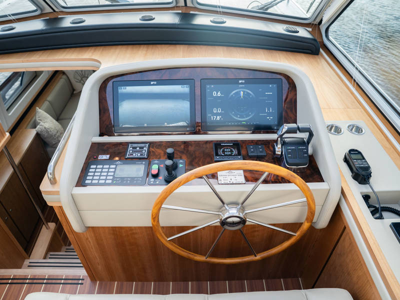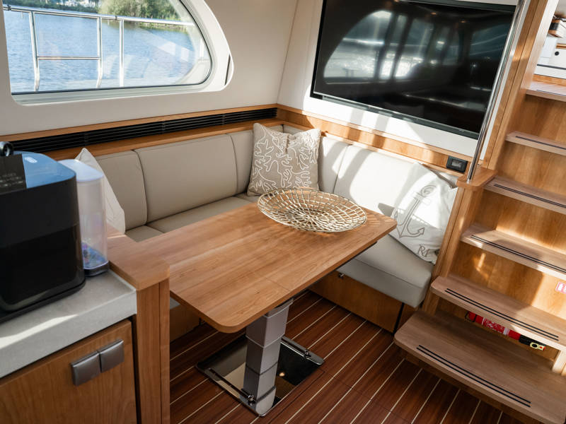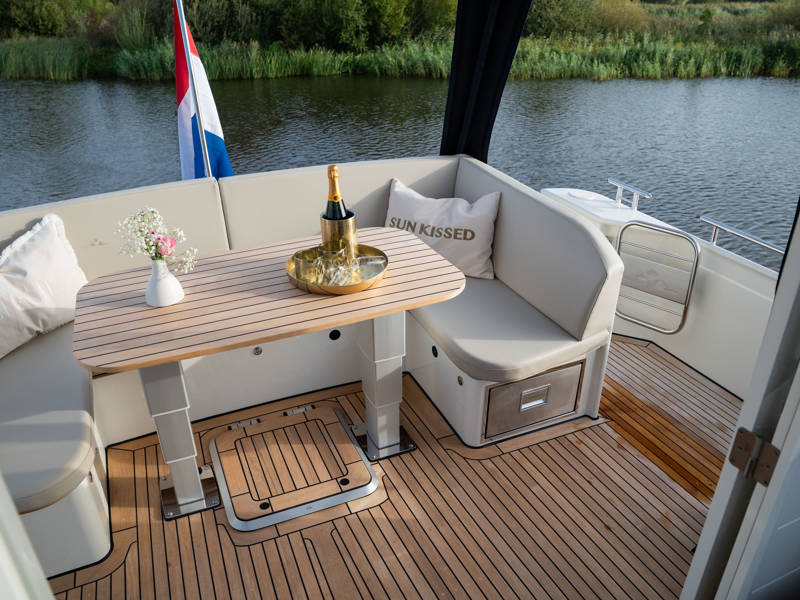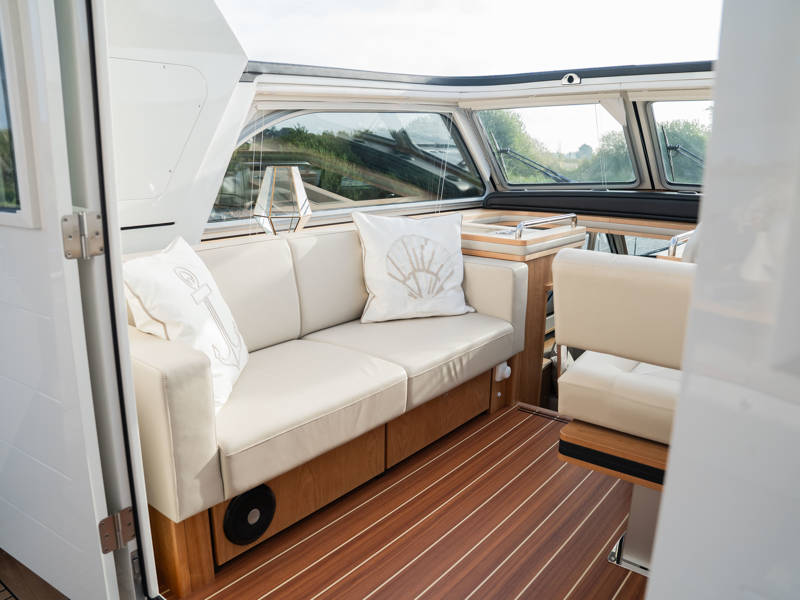 Das Steuerhaus verfügt über eine luxuriöse, elektrisch verstellbare Doppel-Steuerbank sowie eine zweite Sitzbank – perfekt für gemeinsame Momente während der Fahrt. Die Türen verbinden das Steuerhaus nahtlos mit dem Achterdeck und schaffen eine großzügige Lounge-Atmosphäre. Über dem Achterdeck befindet sich unsere neueste Innovation: ein festes Longtop mit dimmbarer Beleuchtung und Infrarot-Heizelementen – für gemütliche Abende an Deck, auch bei kühlerem Wetter. Die flexible Sitzgruppe lässt sich leicht zu einem komfortablen Sonnenbett umfunktionieren.