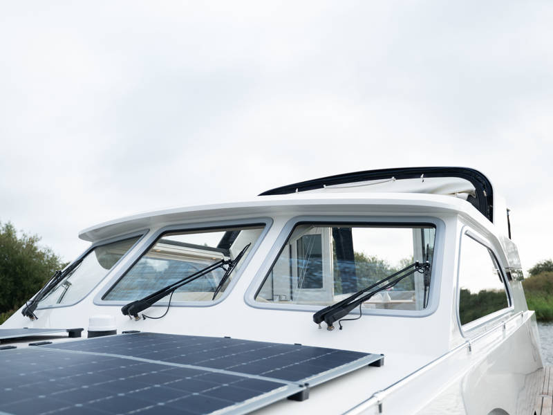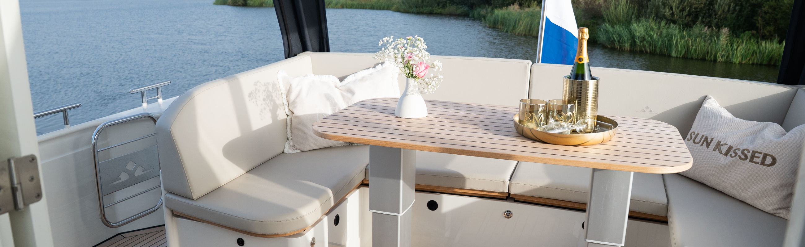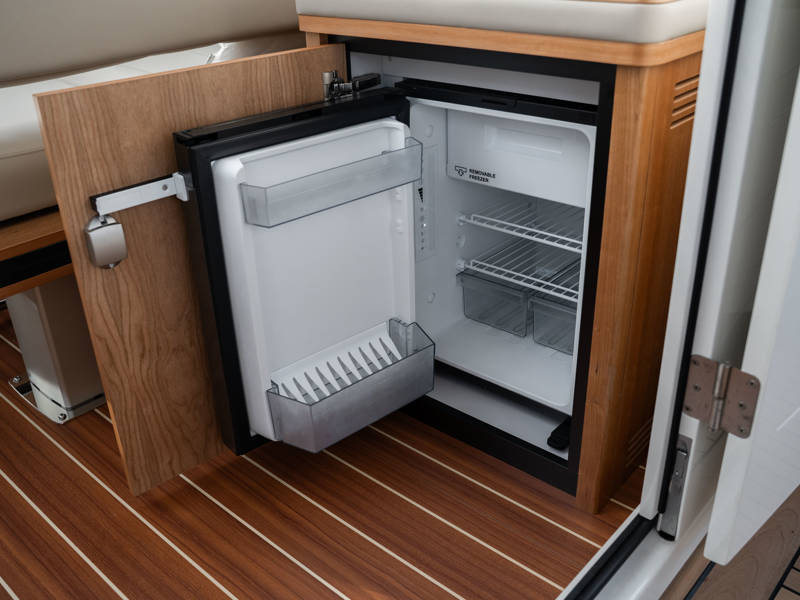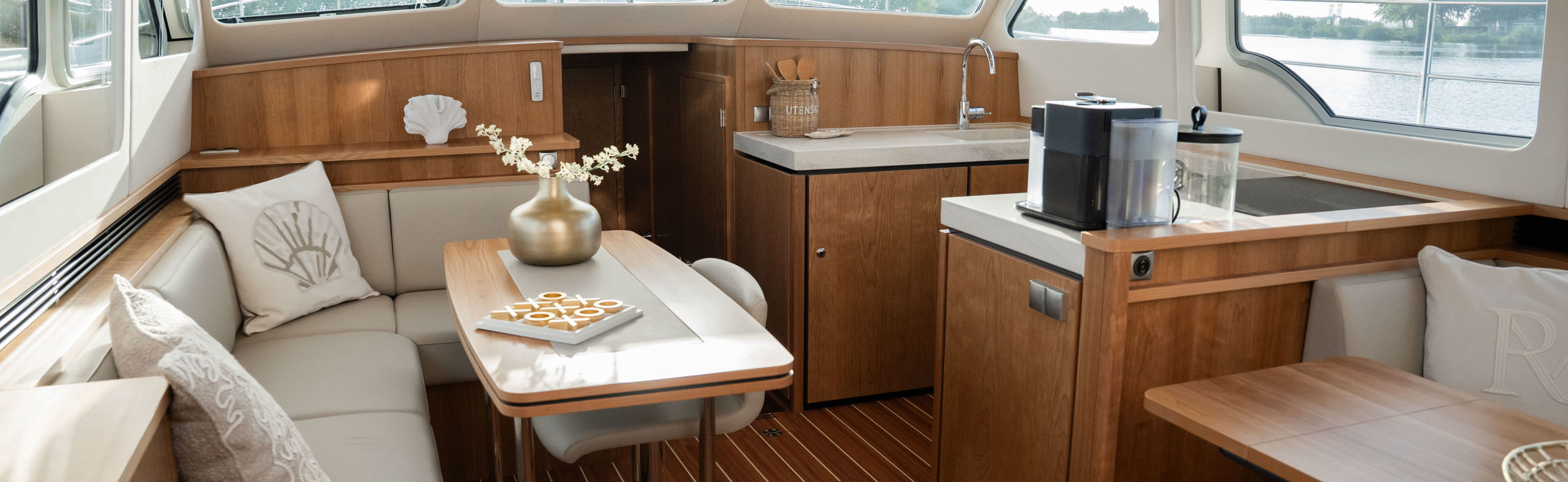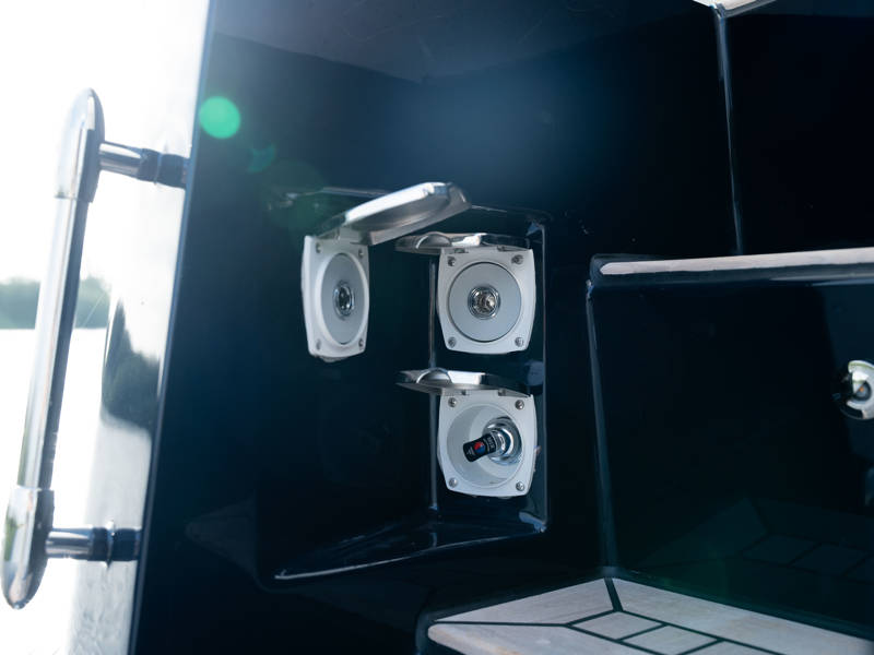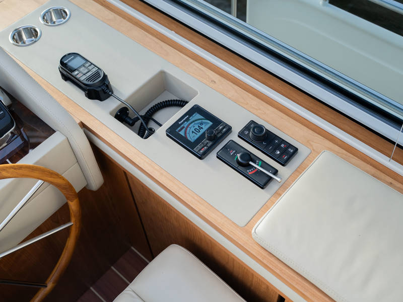 Das Steuerhaus verfügt über eine luxuriöse, elektrisch verstellbare Doppel-Steuerbank sowie eine zweite Sitzbank – perfekt für gemeinsame Momente während der Fahrt. Die Türen verbinden das Steuerhaus nahtlos mit dem Achterdeck und schaffen eine großzügige Lounge-Atmosphäre. Über dem Achterdeck befindet sich unsere neueste Innovation: ein festes Longtop mit dimmbarer Beleuchtung und Infrarot-Heizelementen – für gemütliche Abende an Deck, auch bei kühlerem Wetter. Die flexible Sitzgruppe lässt sich leicht zu einem komfortablen Sonnenbett umfunktionieren.