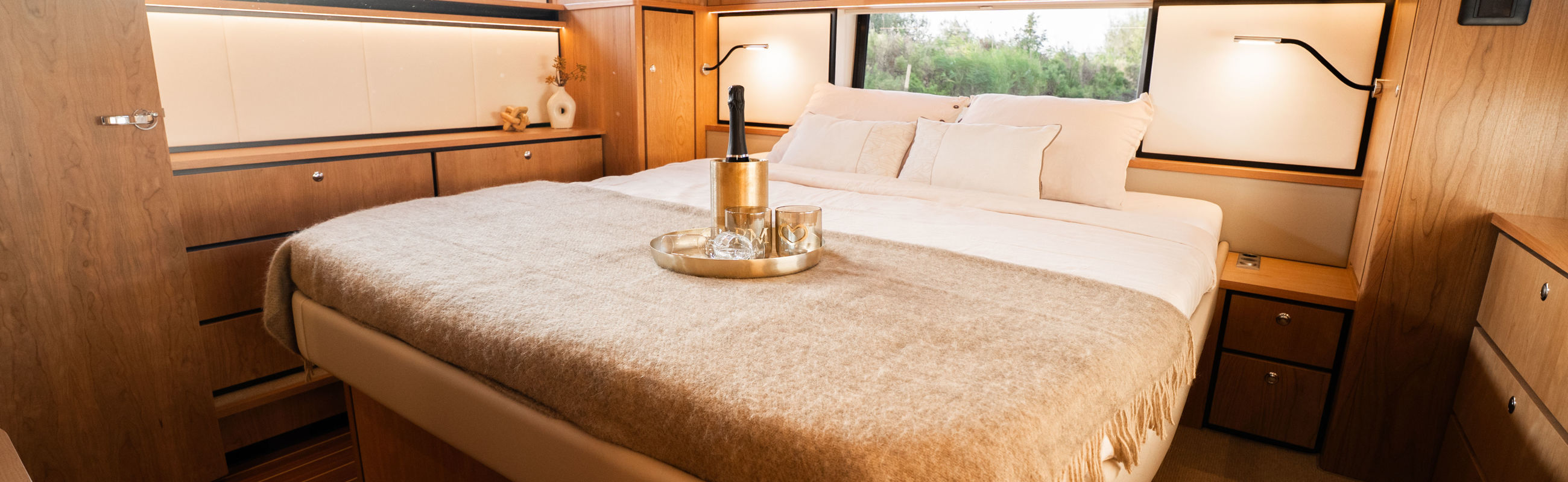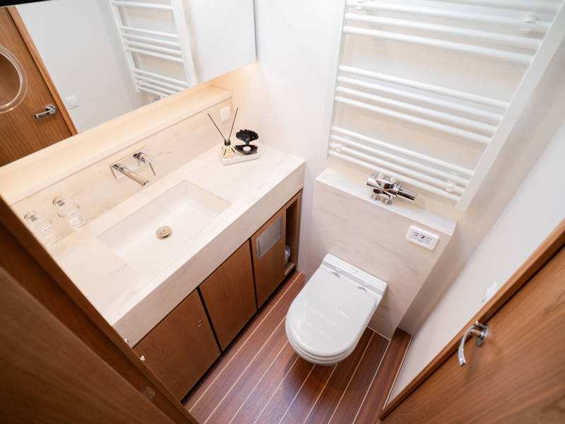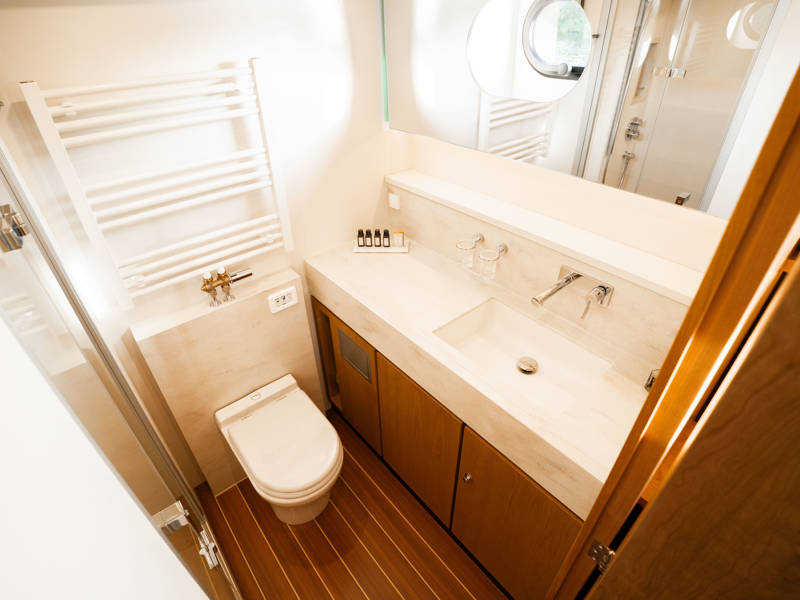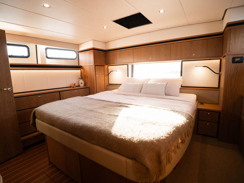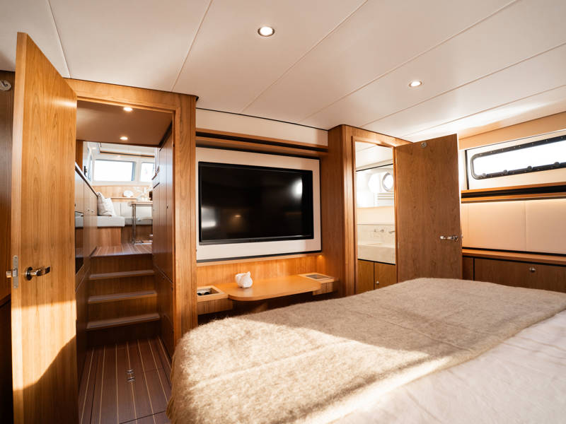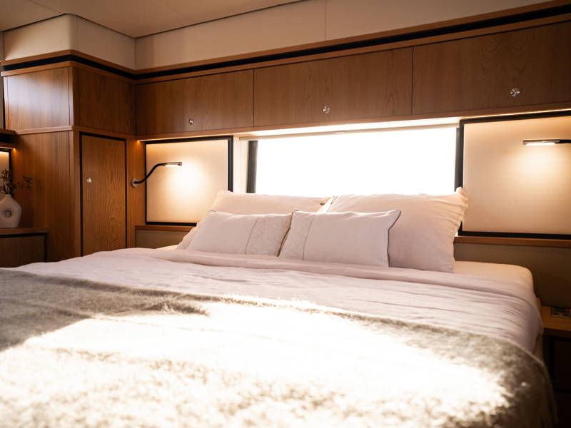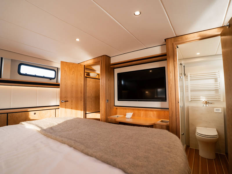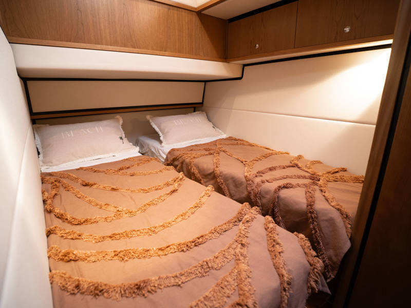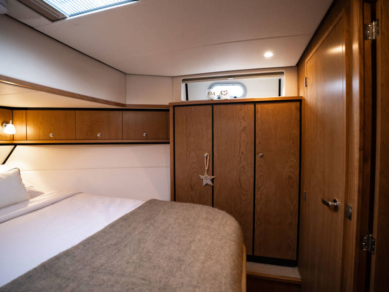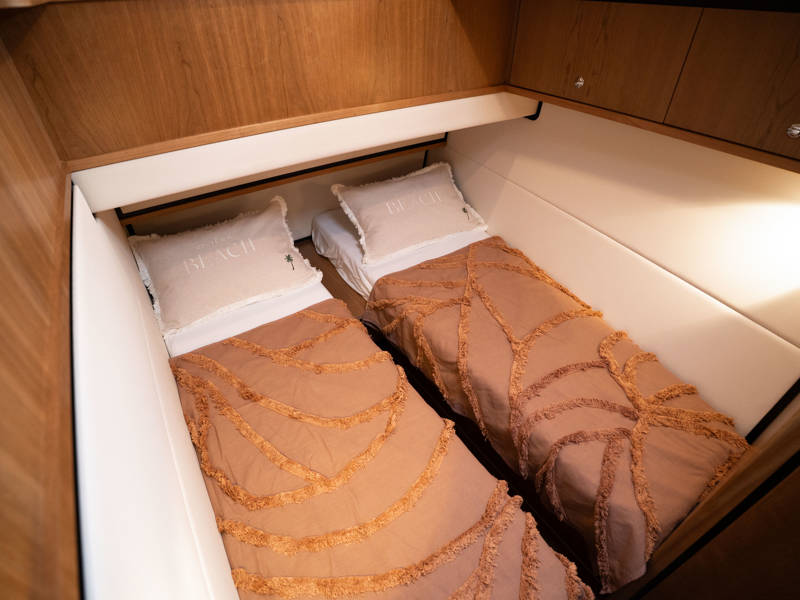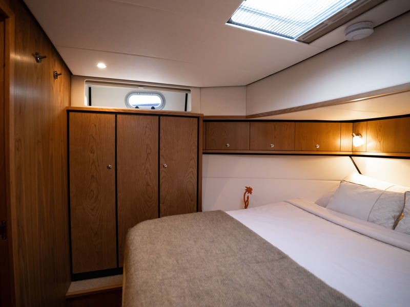 Im Vorschiff liegt eine Kabine mit Doppelbett, Kleiderschränken, eigenem Bad mit elektrischem WC und Waschtisch sowie eine separate Dusche mit integrierter Wasch-Trockner-Kombination. Die Gästekabine bietet zwei Einzelbetten, von denen eines zu einem Doppelbett umfunktioniert werden kann.