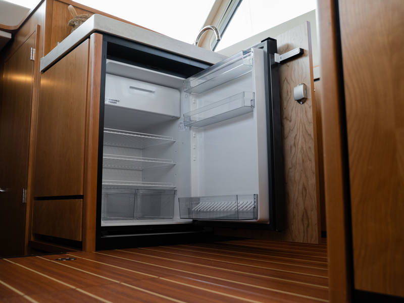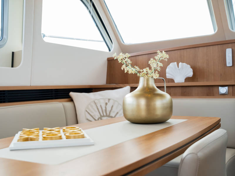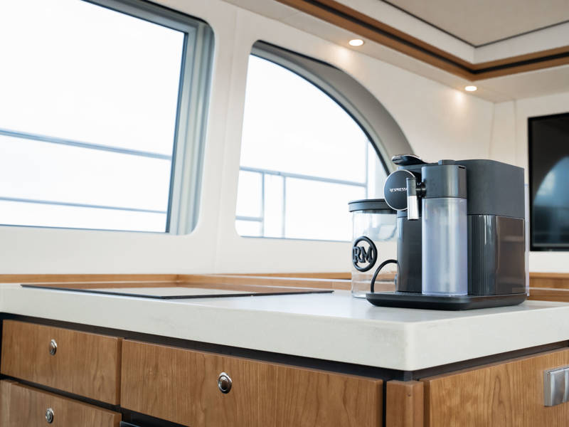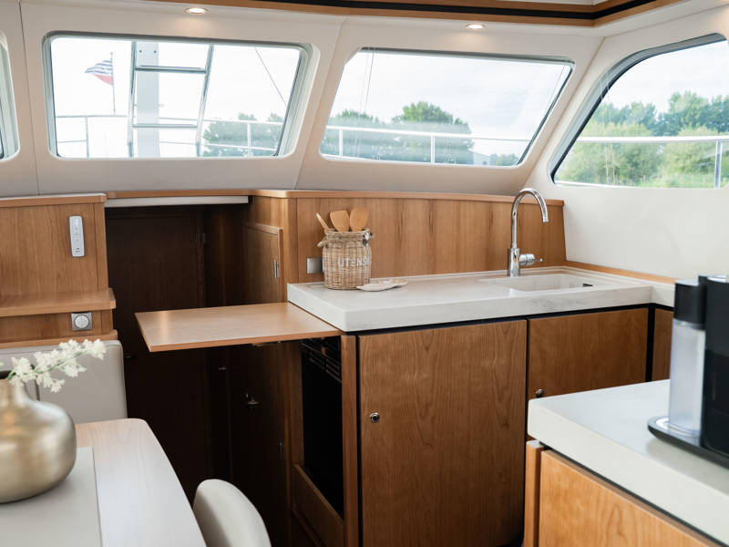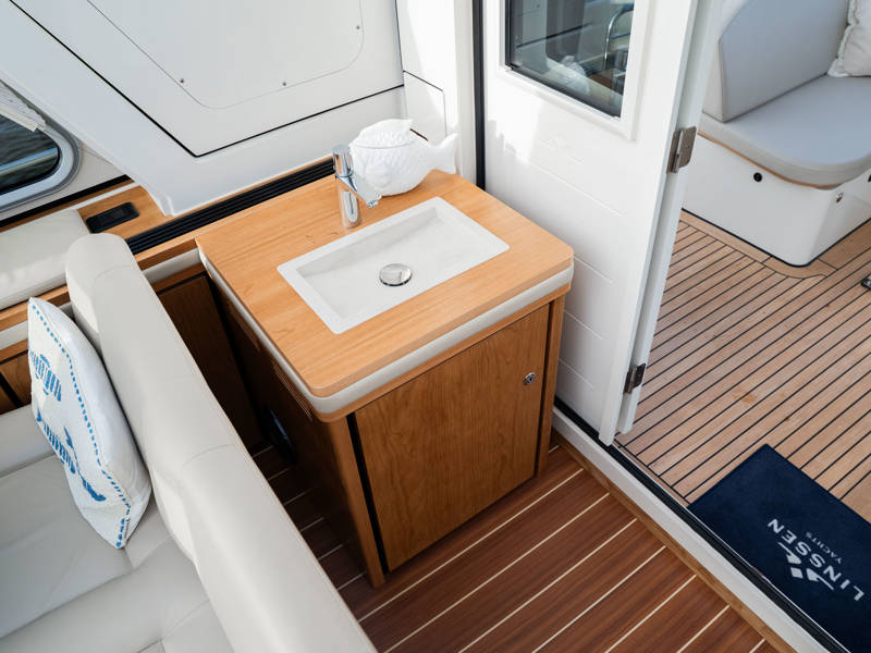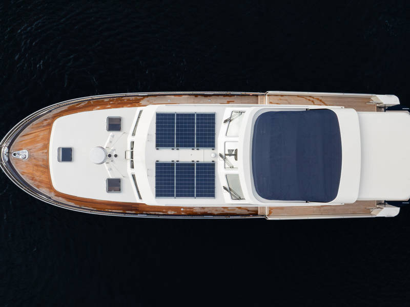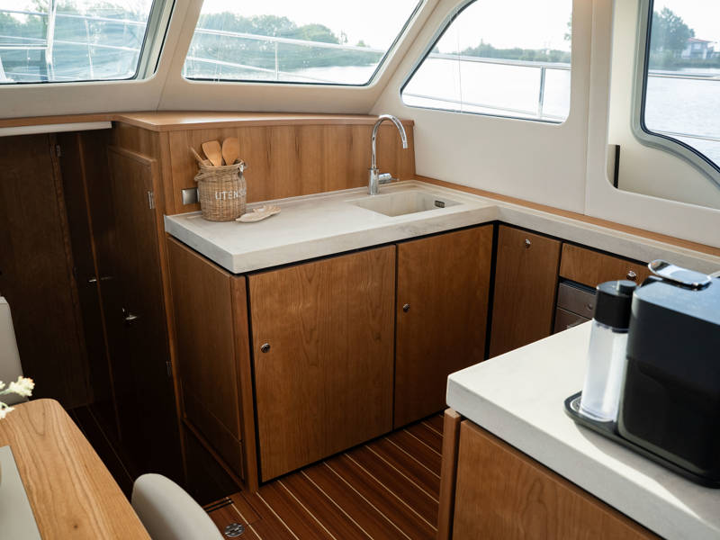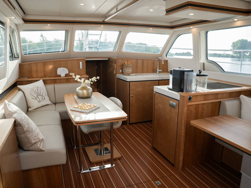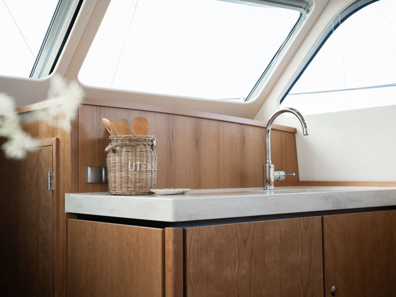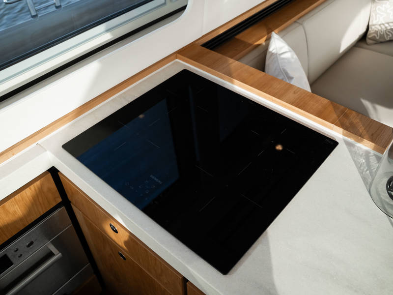 Die Kombüse ist mit Induktionskochfeld, Geschirrspüler und Kombi-Backofen ausgestattet. Klimaanlage und eine leistungsstarke Generatoranlage sorgen dafür, dass Sie überall an Bord in den vollen Genuss aller Annehmlichkeiten kommen. Die stilvollen Plissee-Rollos in Salon und Steuerhaus sind elektrisch steuerbar.