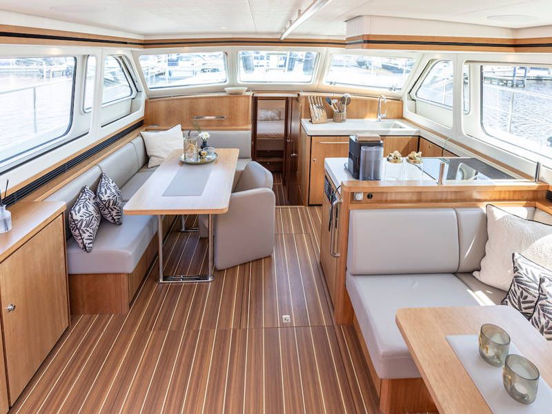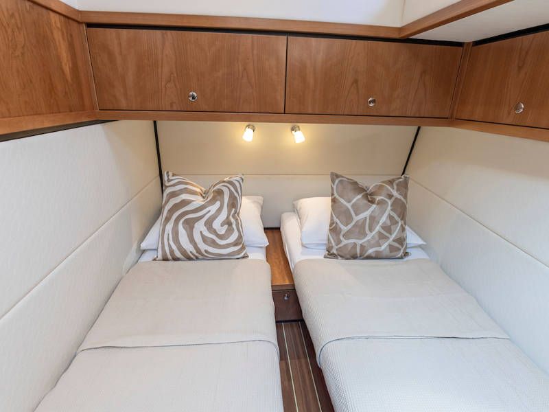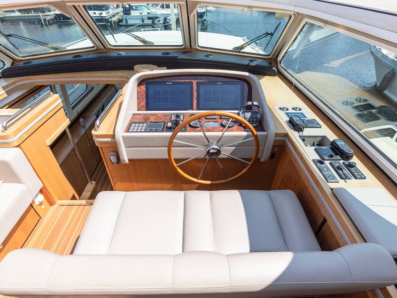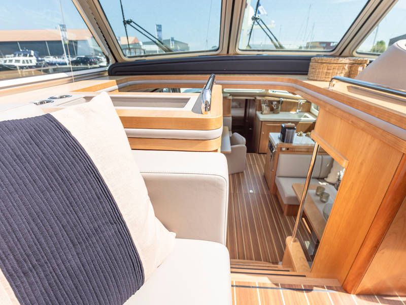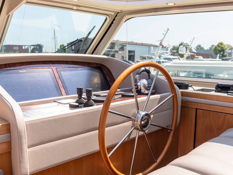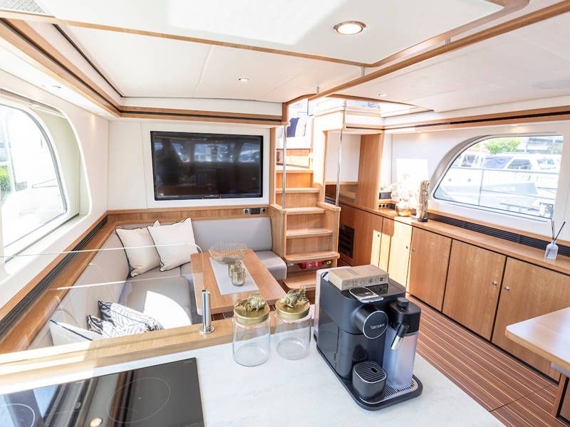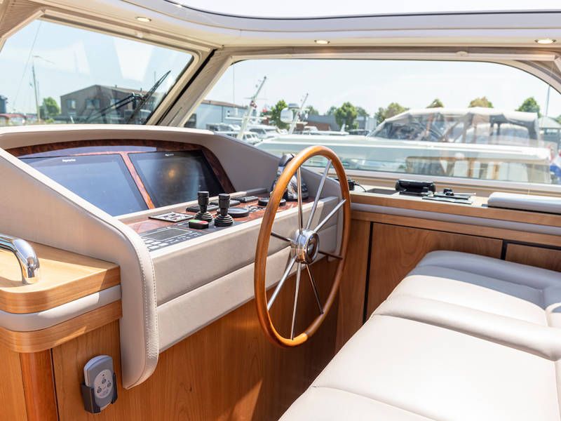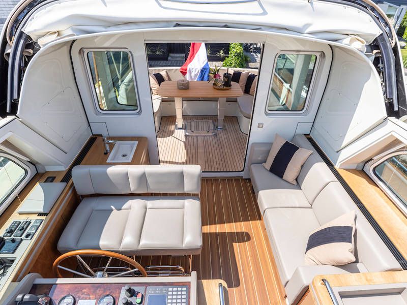 Die Aufteilung ist perfekt geeignet für 6 Personen es gibt selbst ein Möglichkeit mit 8 Personen an Bord zu schlafen, weil es zwei extra Schlafplätze gibt in der Salon. Im Steuersalon verfügt das Armaturenbrett über alle erdenklichen Navigationshilfen und oberhalb der Steuerbank befindet sich das elektrisch bedienbare Variotop-Dach. Das Steuerhaus verfügt über ausreichend Sitzplätze und eine Spülbecken mit einem zusätzlichen Kühlschrank.