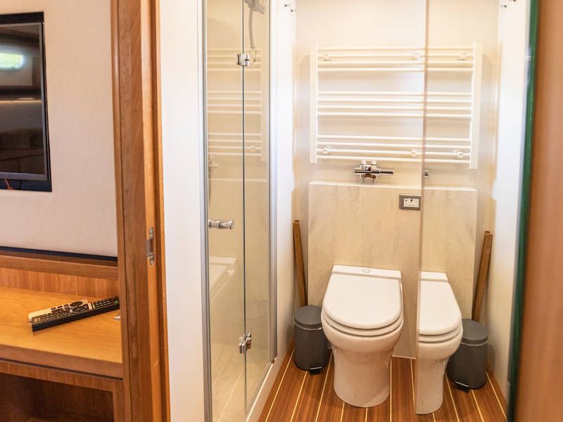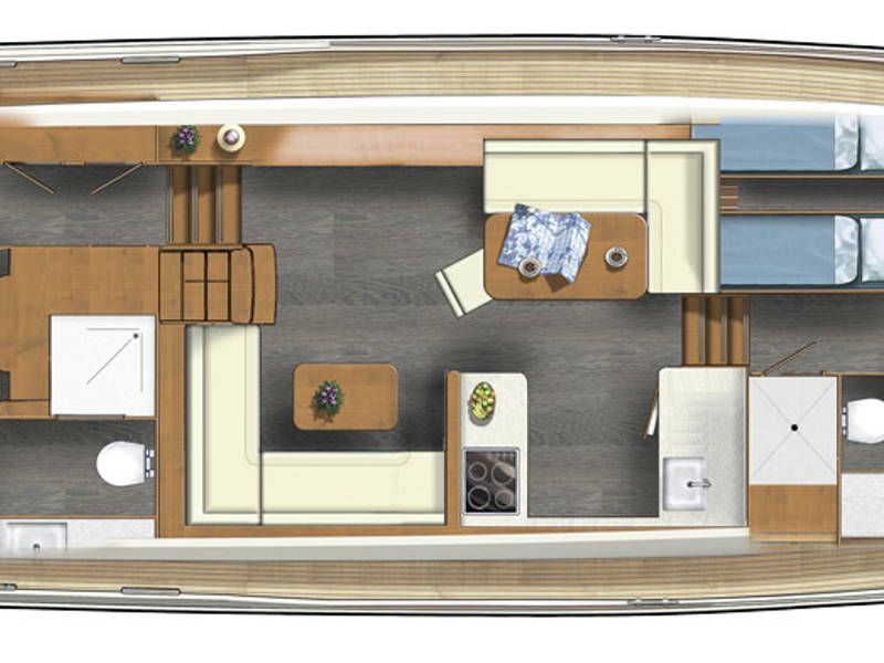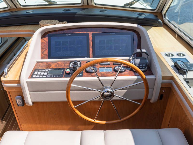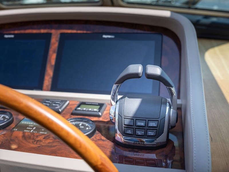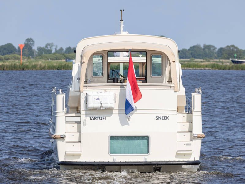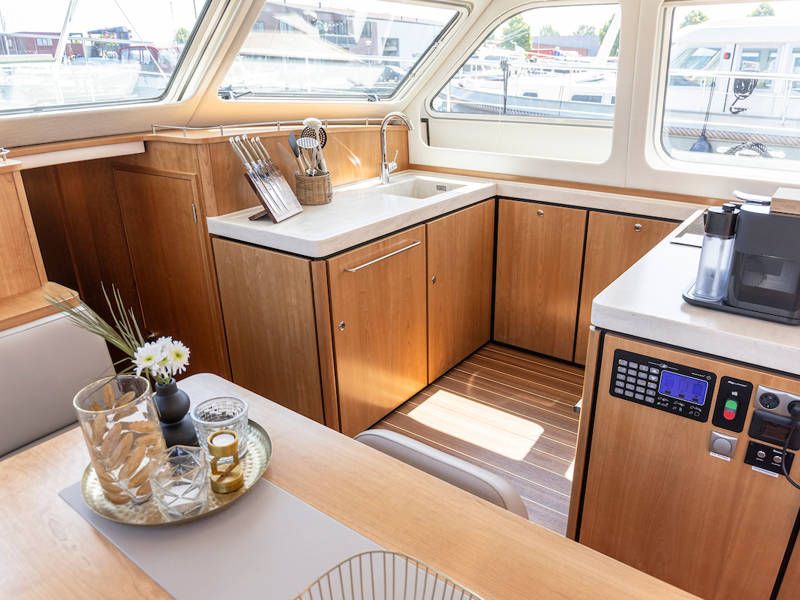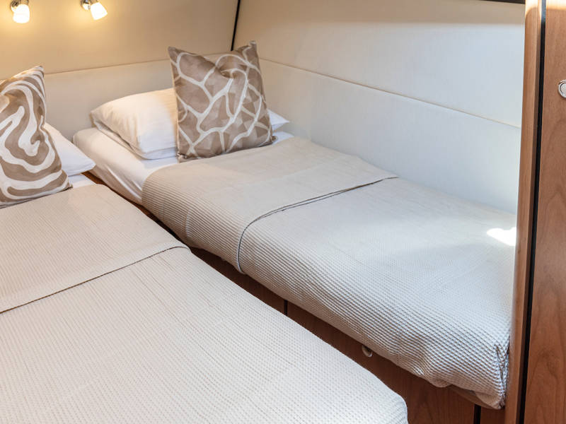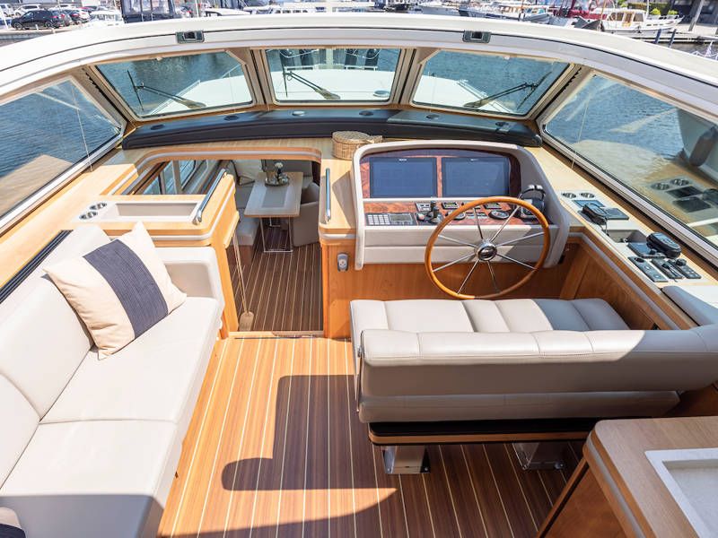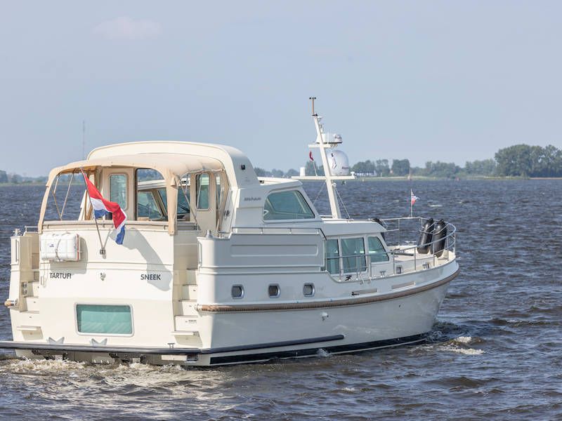 Die Aufteilung ist perfekt geeignet für 6 Personen es gibt selbst ein Möglichkeit mit 8 Personen an Bord zu schlafen, weil es zwei extra Schlafplätze gibt in der Salon. Im Steuersalon verfügt das Armaturenbrett über alle erdenklichen Navigationshilfen und oberhalb der Steuerbank befindet sich das elektrisch bedienbare Variotop-Dach. Das Steuerhaus verfügt über ausreichend Sitzplätze und eine Spülbecken mit einem zusätzlichen Kühlschrank.