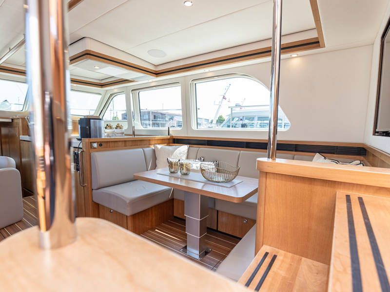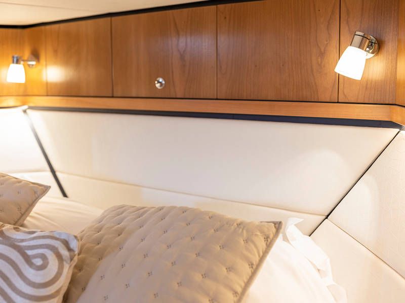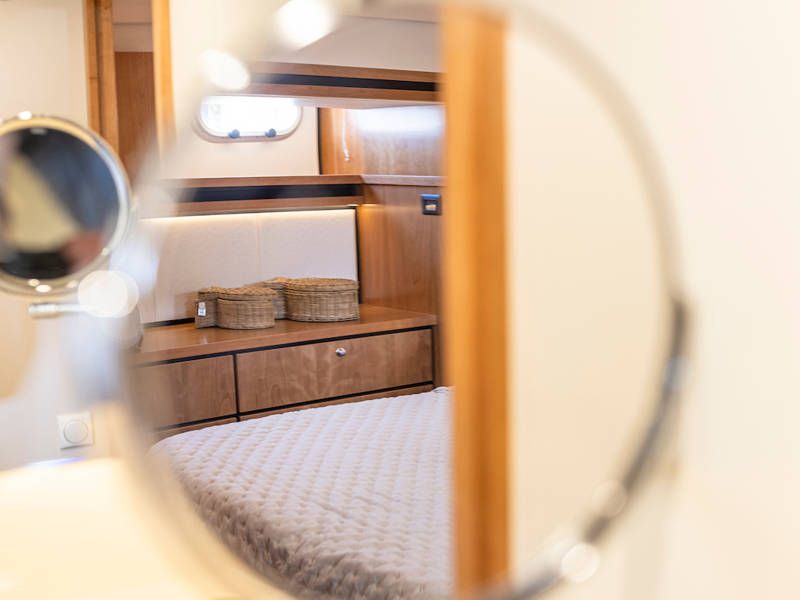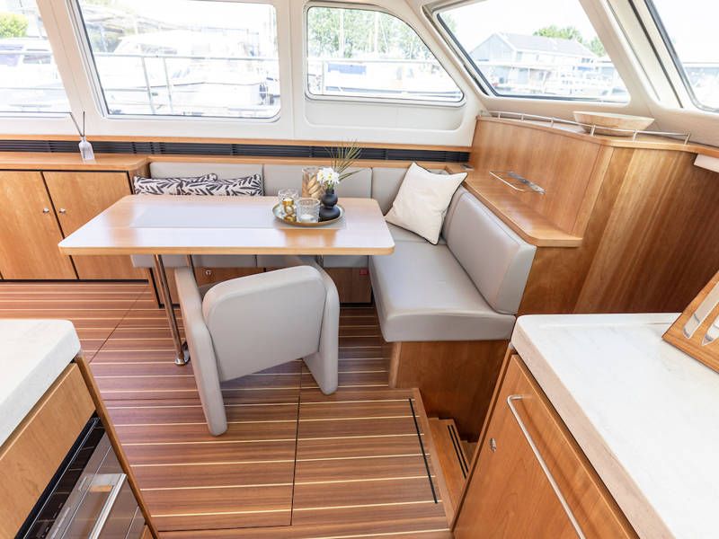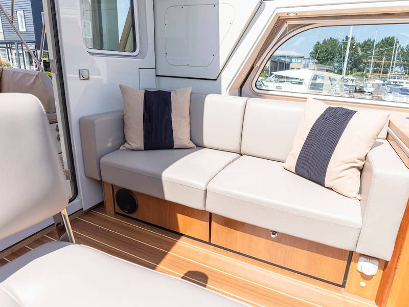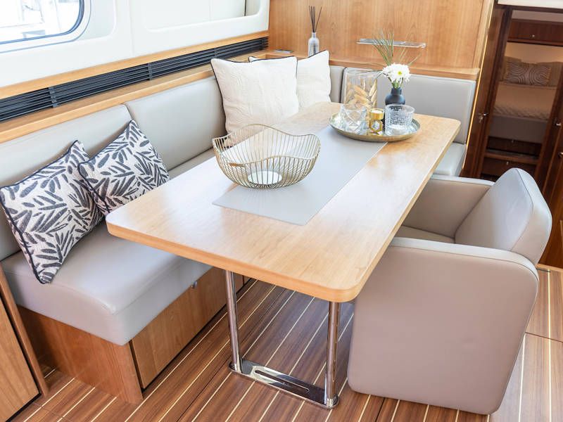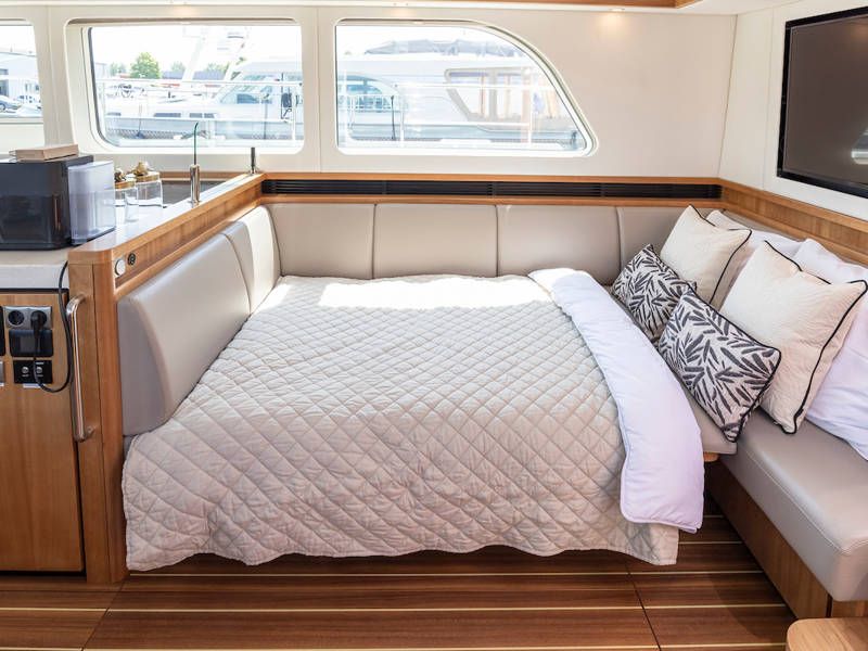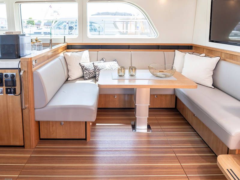 Dieser Teil der Yacht ist dank der soliden Türen vollständig abschließbar und beheizbar. Auf dem Achterdeck gibt es außerdem eine großzügige Sitzecke mit einem höhenverstellbaren Tisch. Die Badeplattform wurde verlängert und ist außerdem versenkbar. Somit wird Baden ein noch größerer Spaß!