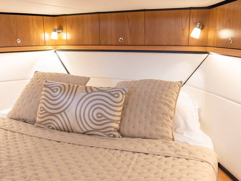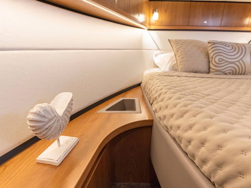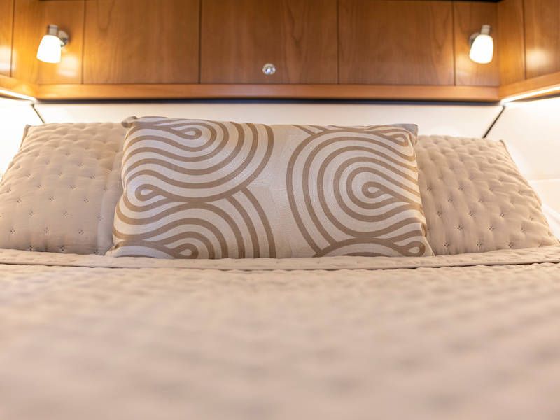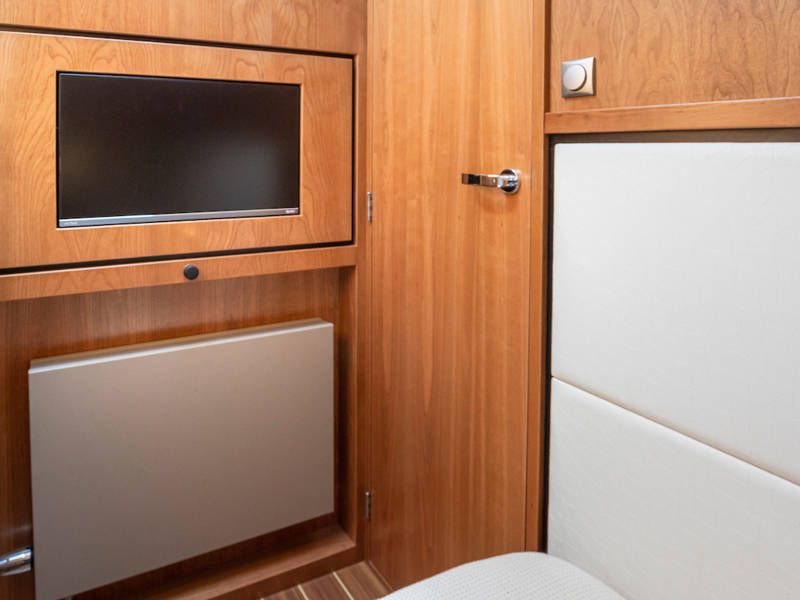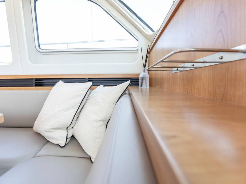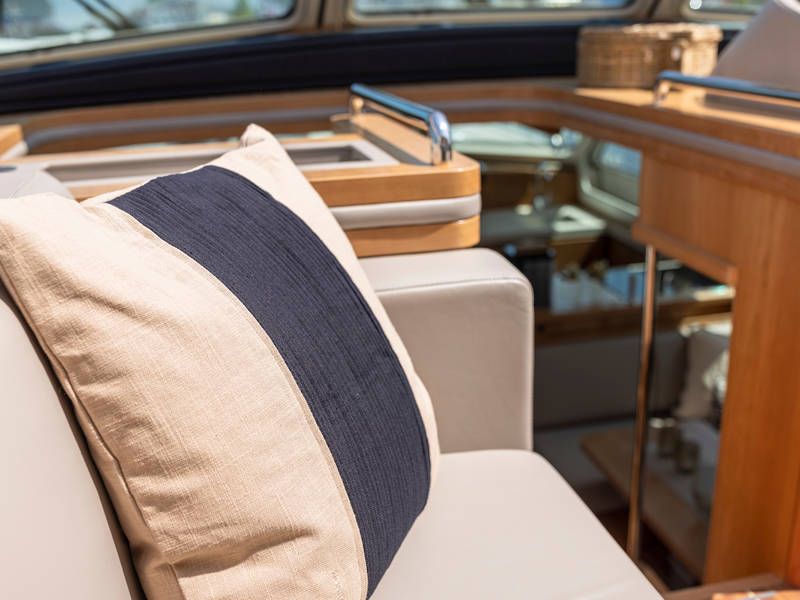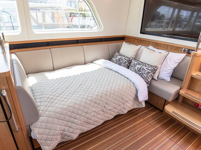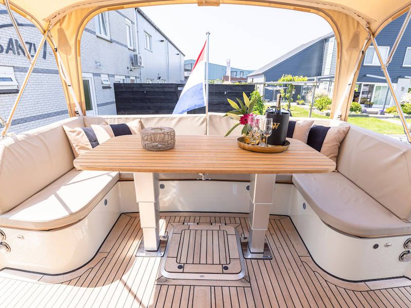 Dieser Teil der Yacht ist dank der soliden Türen vollständig abschließbar und beheizbar. Auf dem Achterdeck gibt es außerdem eine großzügige Sitzecke mit einem höhenverstellbaren Tisch. Die Badeplattform wurde verlängert und ist außerdem versenkbar. Somit wird Baden ein noch größerer Spaß!
