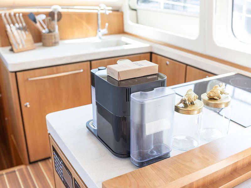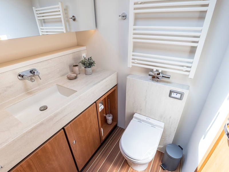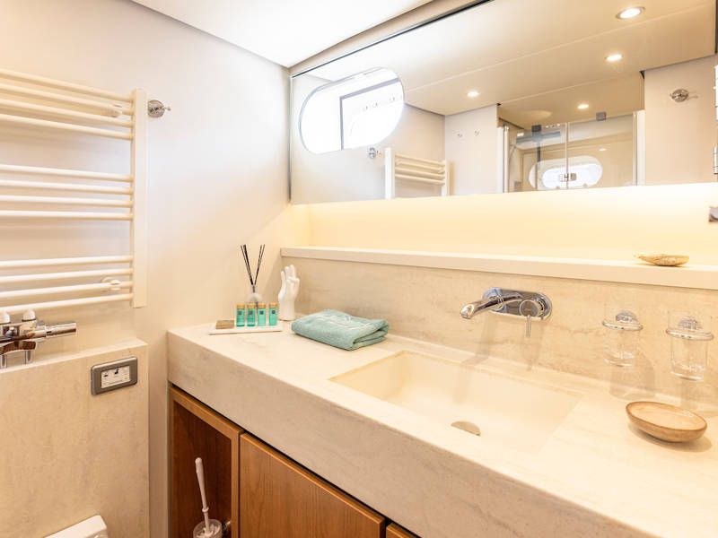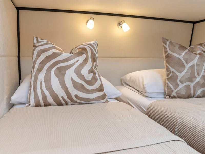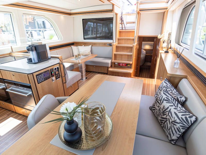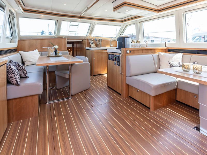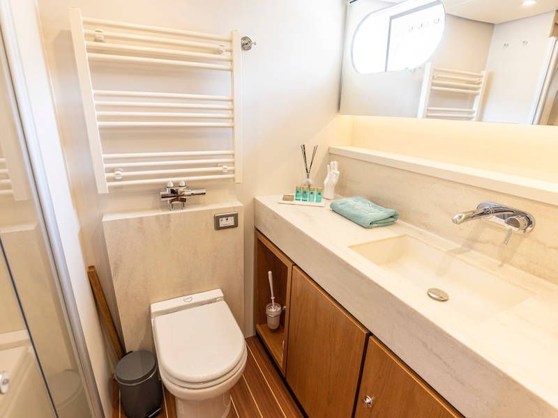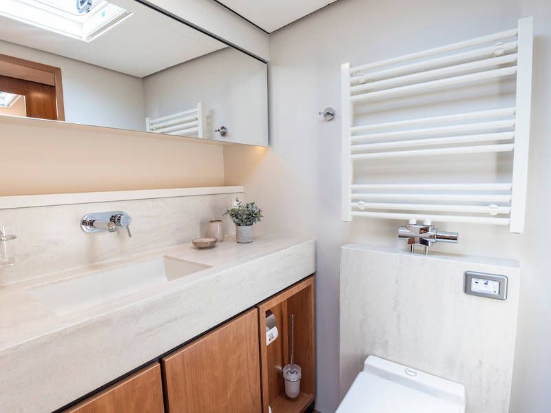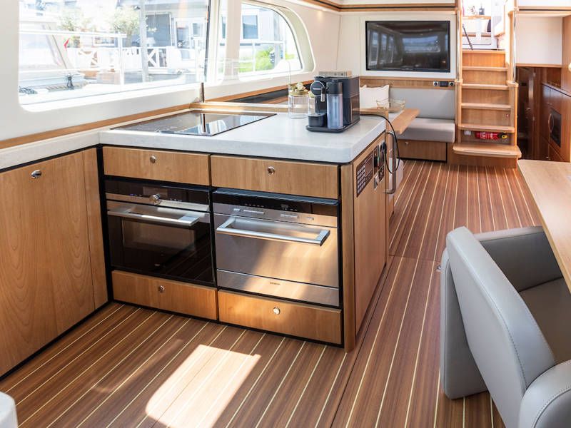 Unter Deck gibt es drei großzügige Doppelschlafkojen, zwei Badezimmer, zwei Toiletten. Eine voll ausgestattete Küche mit Kombibackofen, Geschirrspüler, Induktionskochfeld sowie eine integrierte, Luxus-Espressomaschine runden das luxuriöse Erlebnis ab.