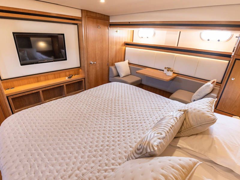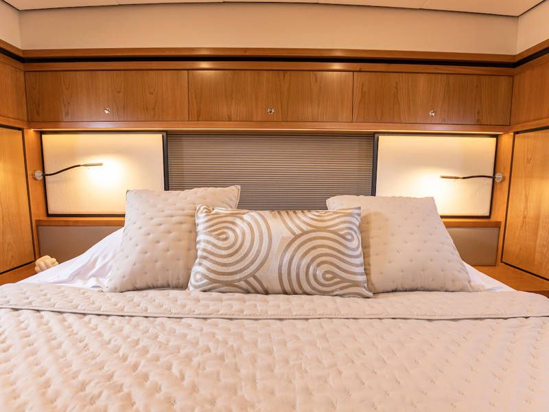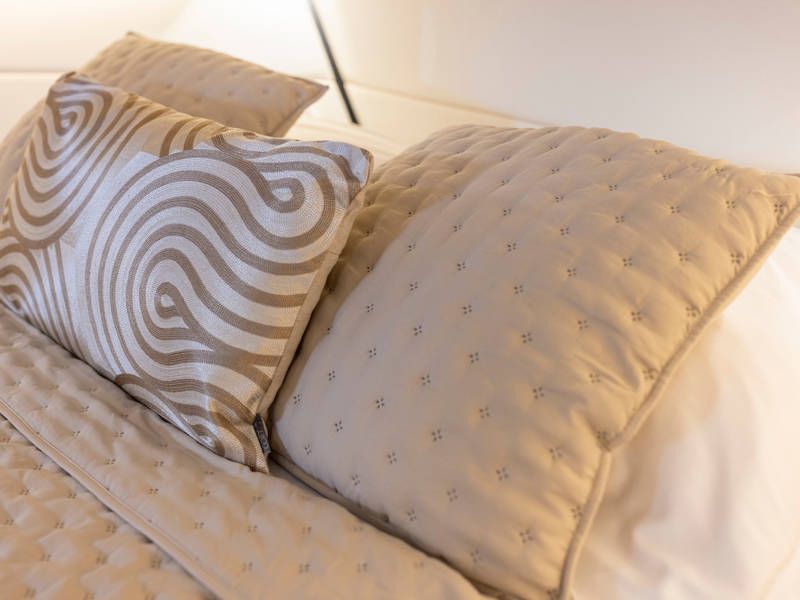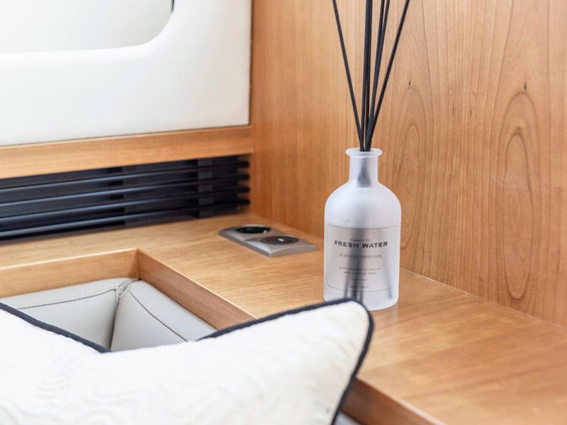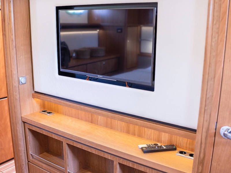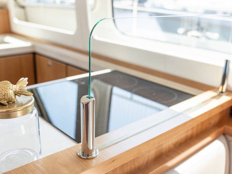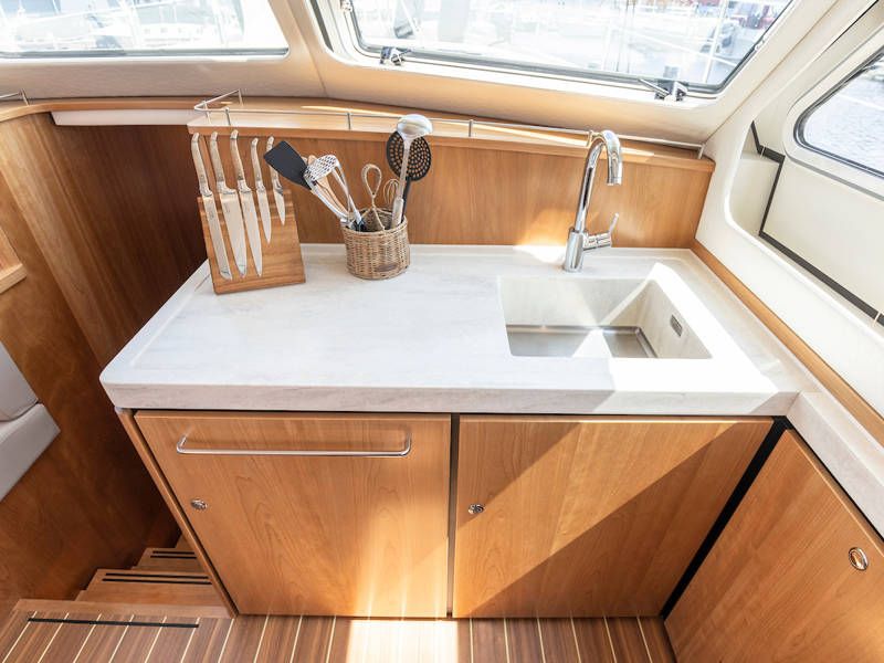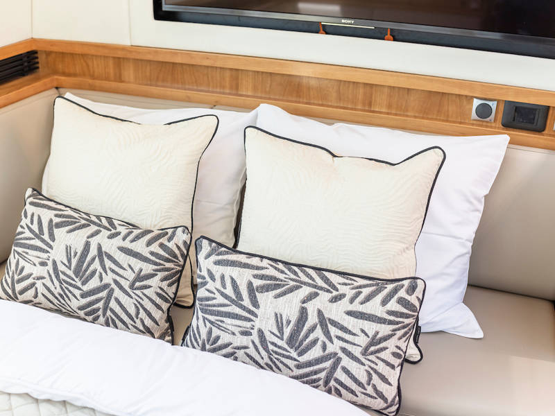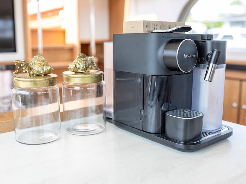 Unter Deck gibt es drei großzügige Doppelschlafkojen, zwei Badezimmer, zwei Toiletten. Eine voll ausgestattete Küche mit Kombibackofen, Geschirrspüler, Induktionskochfeld sowie eine integrierte, Luxus-Espressomaschine runden das luxuriöse Erlebnis ab.